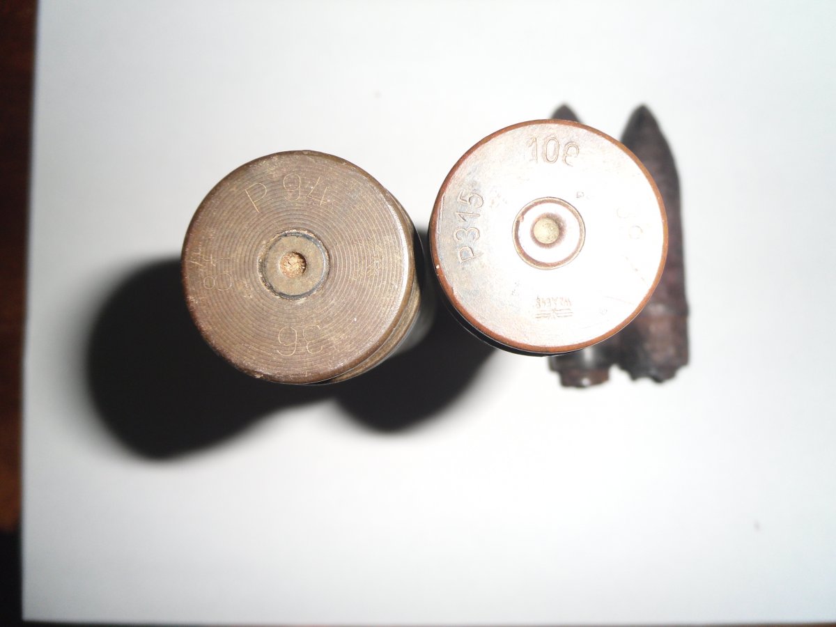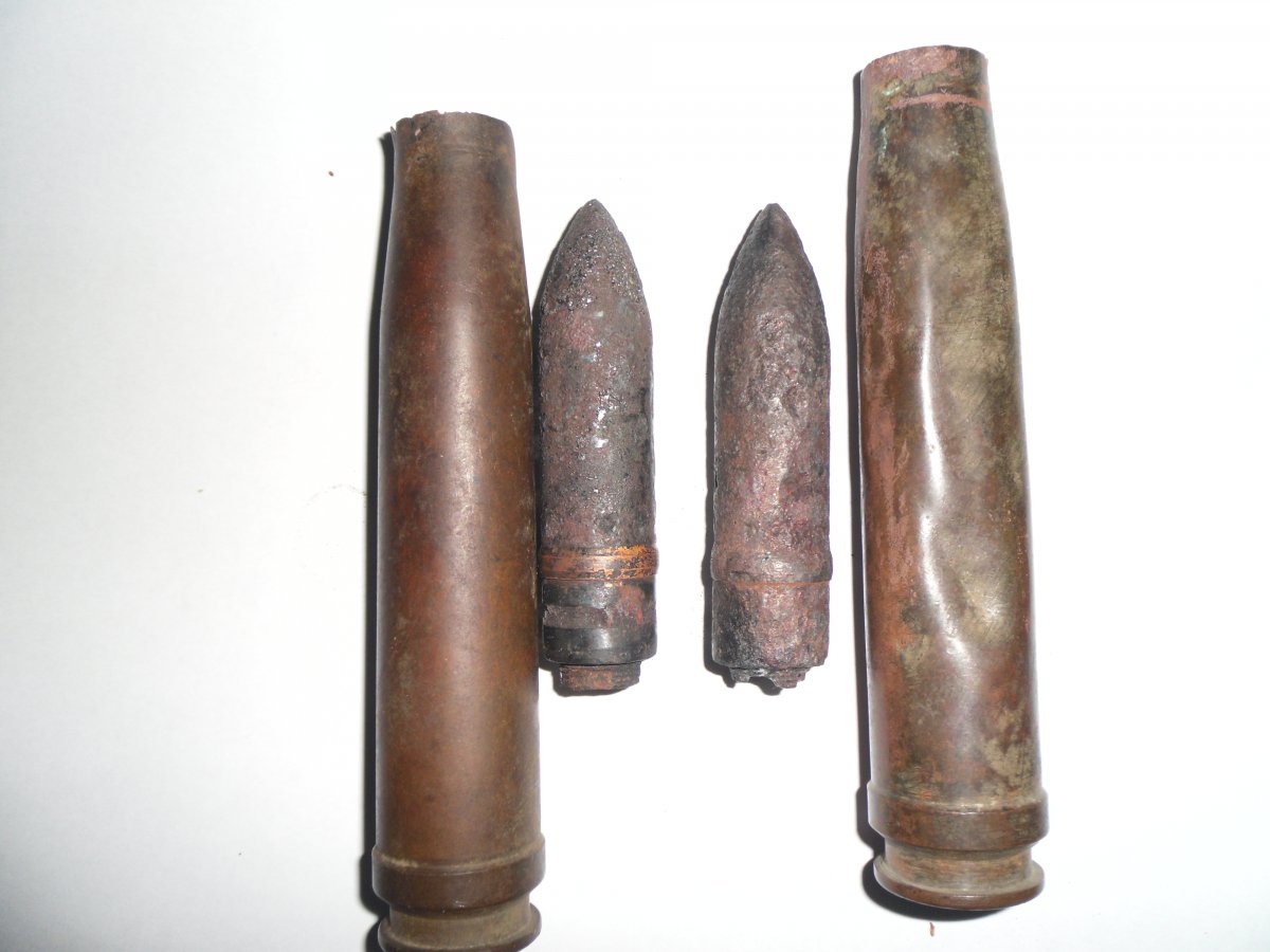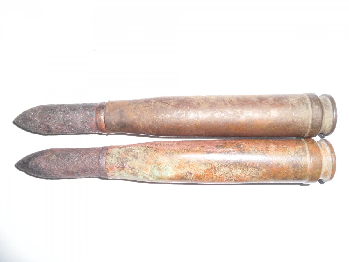 ММГ 20х138 Солотурн. Две штуки. Гильзы латунные. Снарядики бронебойные, прожаренные при высокой температуре. Трассерные втулки не выкручивались. Трассерный состав выгорел. Копанные. Клейма гильз хорошо читаются. В качестве бонуса - одна стальная гильза 138 мм.