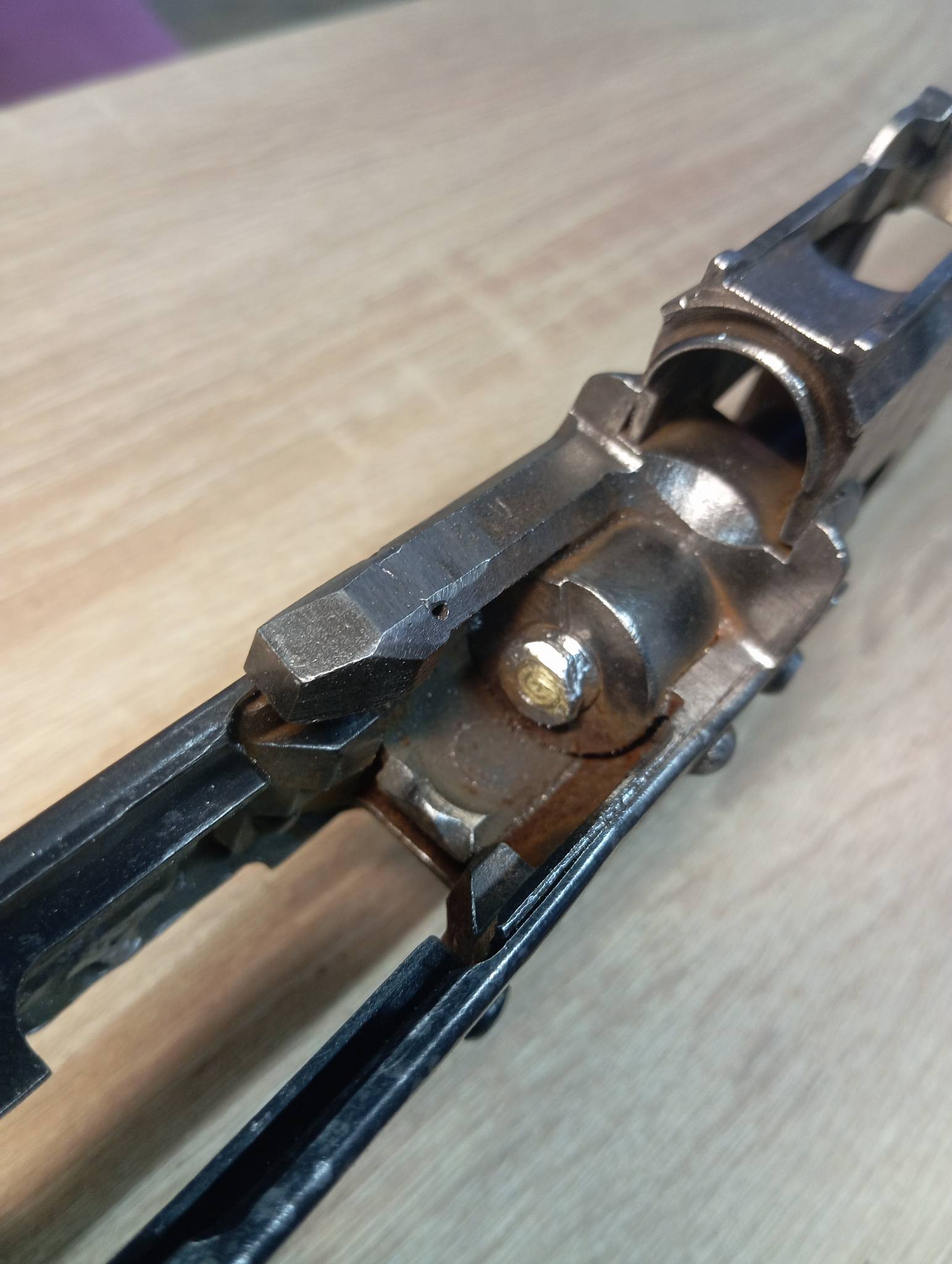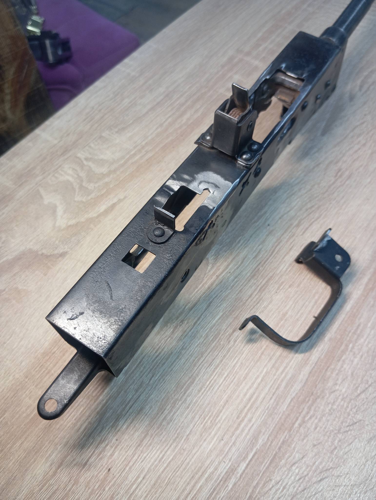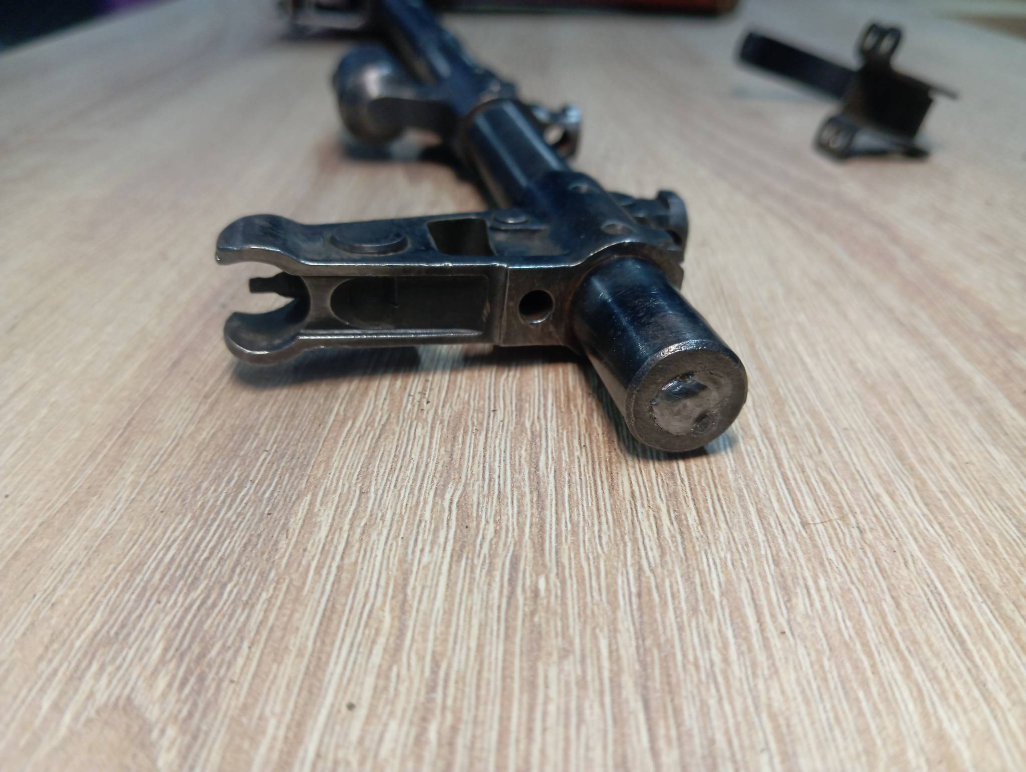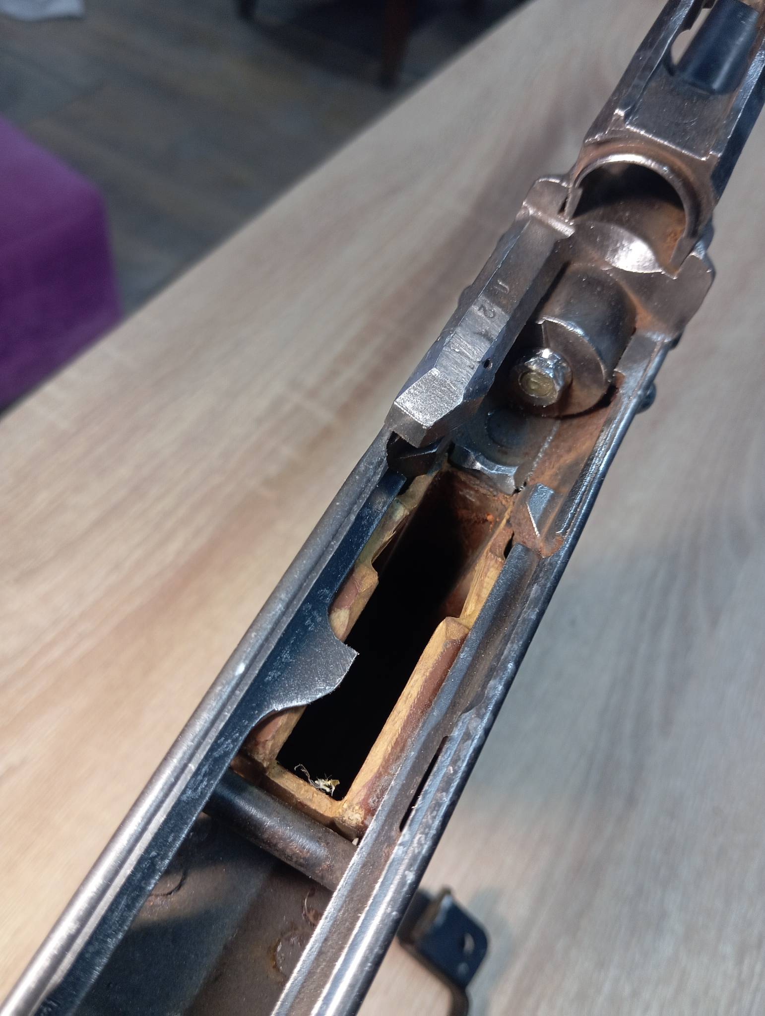 По стволу: є пропил біля патронника. Всередину схоже що вставлений прут і заварений на дульному виході та ще посеред ствола (або ж там штифт просто, не можу сказати напевне, до мене в такому стані потрапив). Ствол прихвачений каплею заварки до рами. В патроннику гільза.