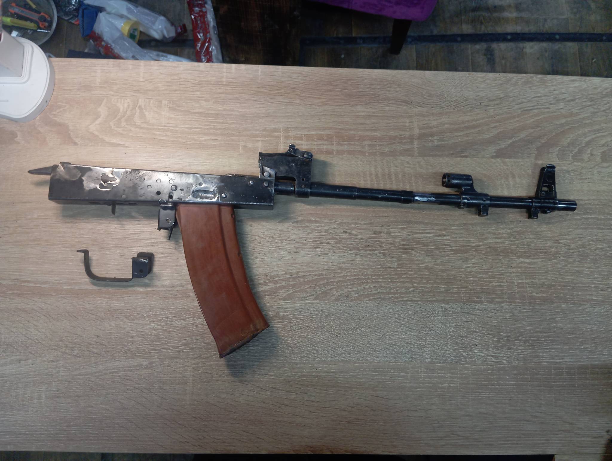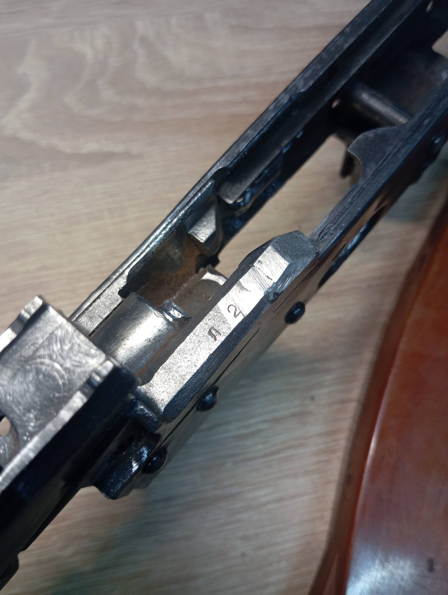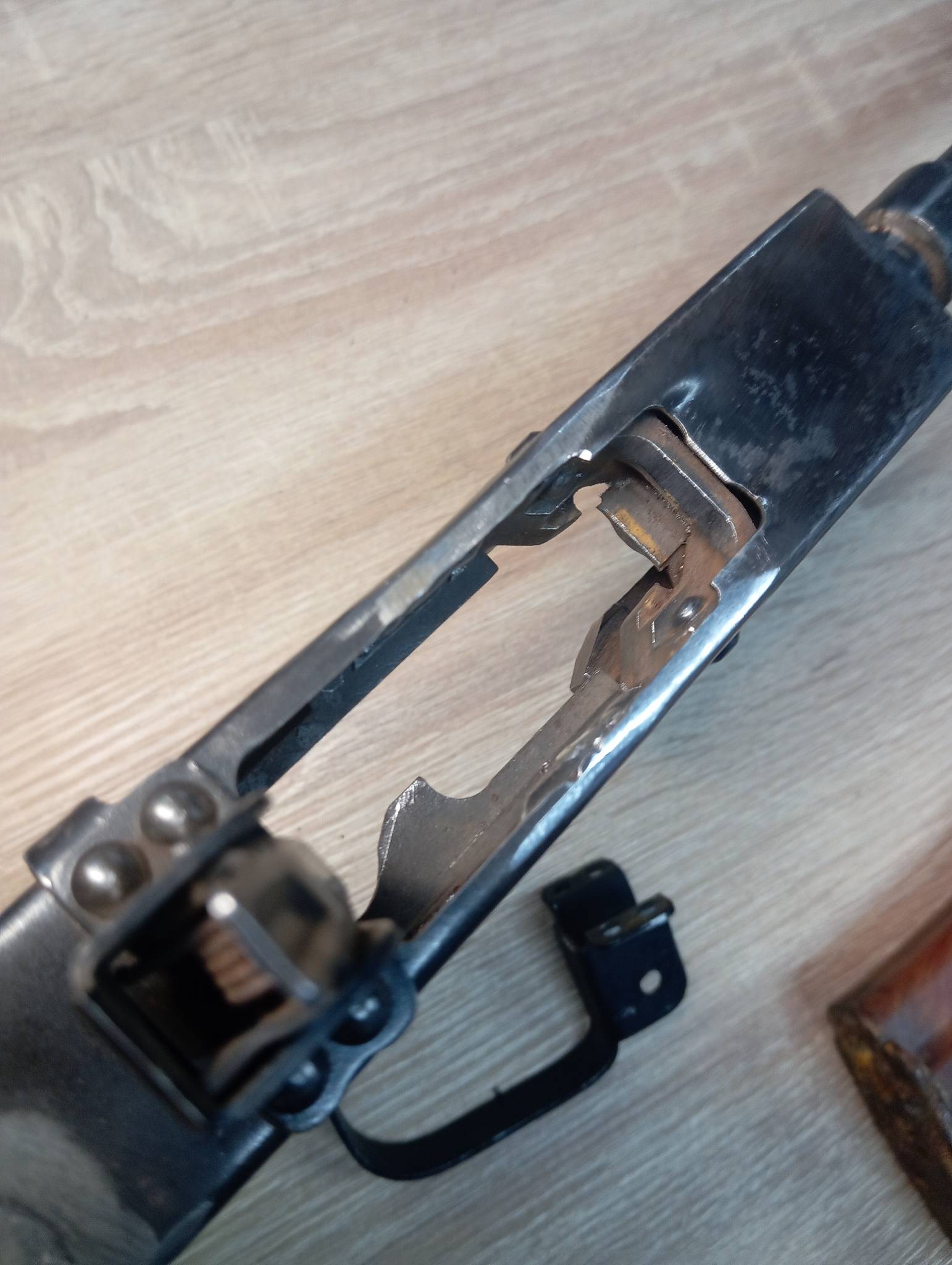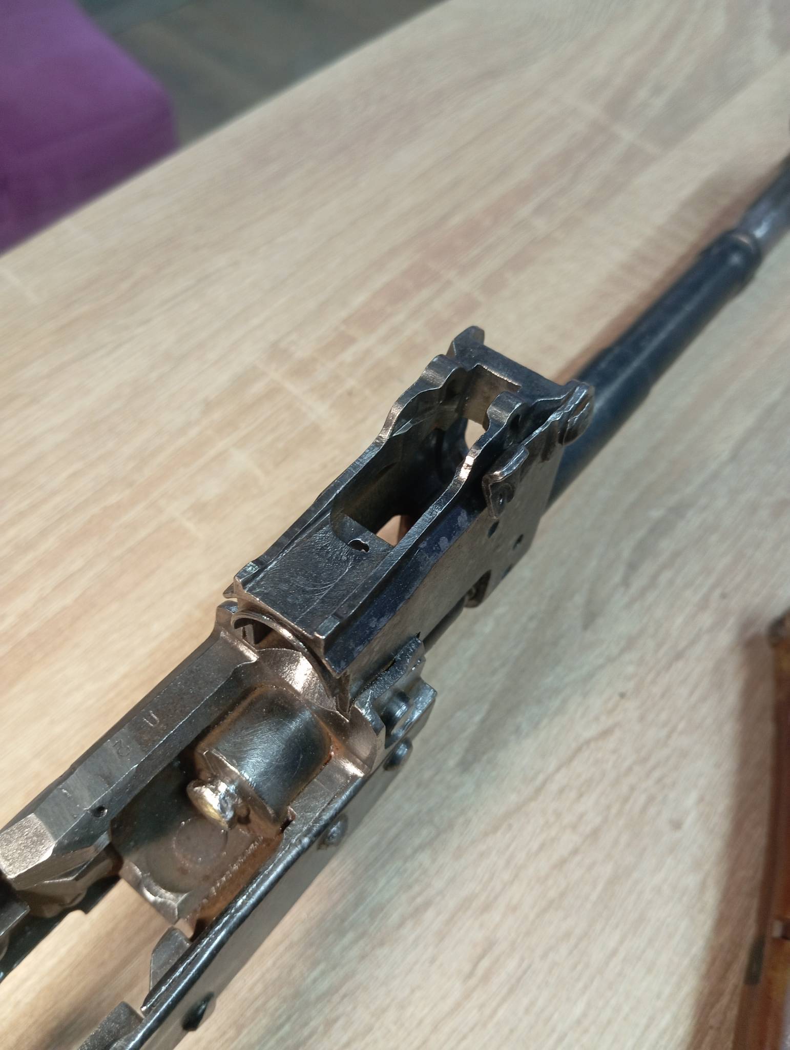 По стволу: є пропил біля патронника. Всередину схоже що вставлений прут і заварений на дульному виході та ще посеред ствола (або ж там штифт просто, не можу сказати напевне, до мене в такому стані потрапив). Ствол прихвачений каплею заварки до рами. В патроннику гільза.
