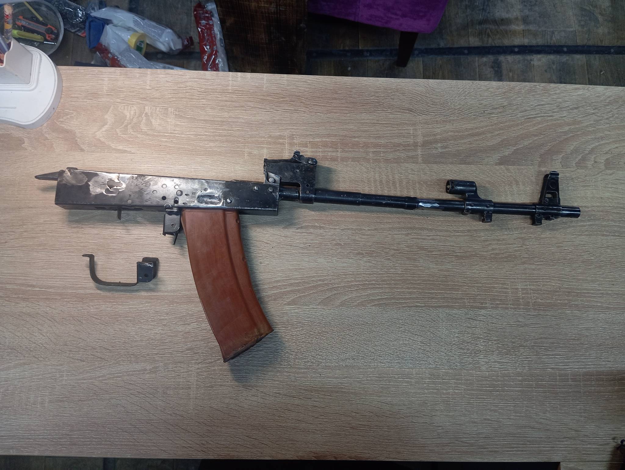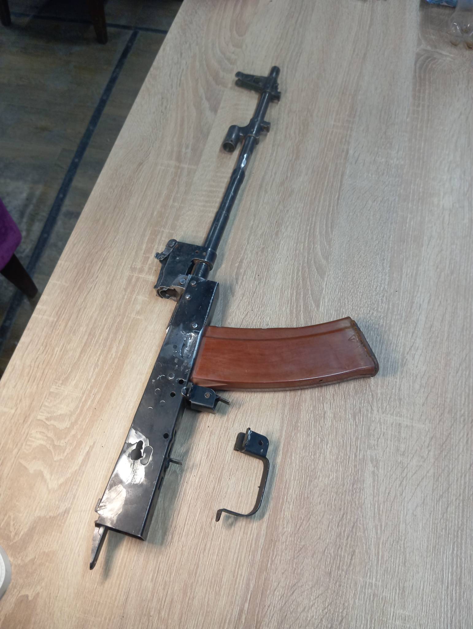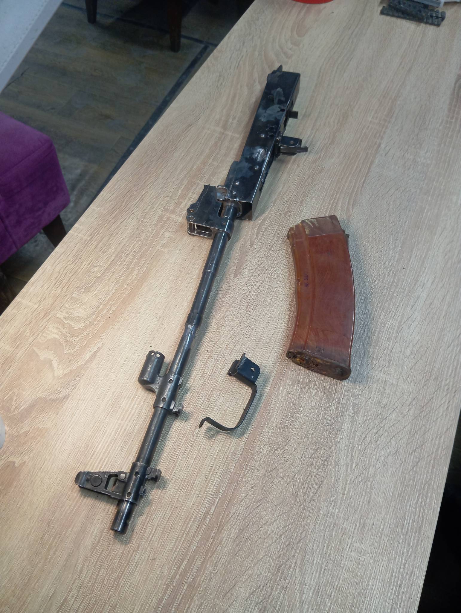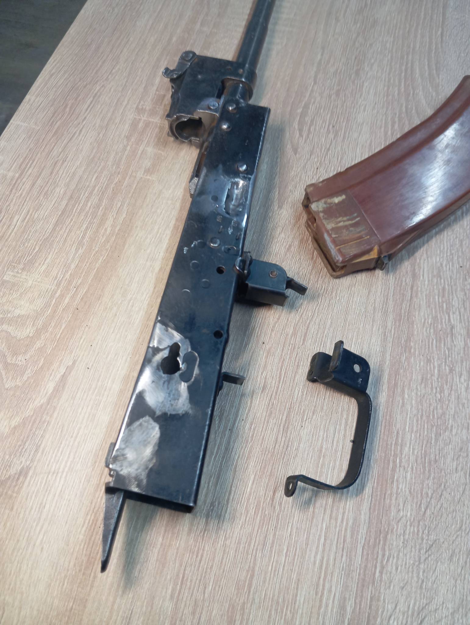 По стволу: є пропил біля патронника. Всередину схоже що вставлений прут і заварений на дульному виході та ще посеред ствола (або ж там штифт просто, не можу сказати напевне, до мене в такому стані потрапив). Ствол прихвачений каплею заварки до рами. В патроннику гільза.