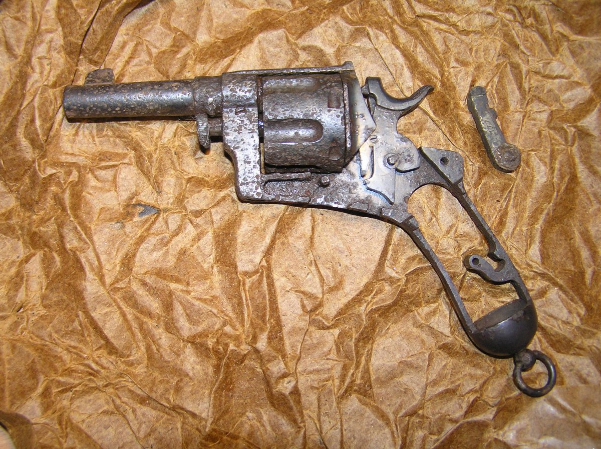 Коп. Некомплект. Барабан шевелится, но не разработан. Деактив -- три отверстия. Много родного воронения, курок с четкими насечками. Отломан винт дверцы барабана. А в остальном всё видно на фото. Одна деревянная накладка (новодел). Раритет.
