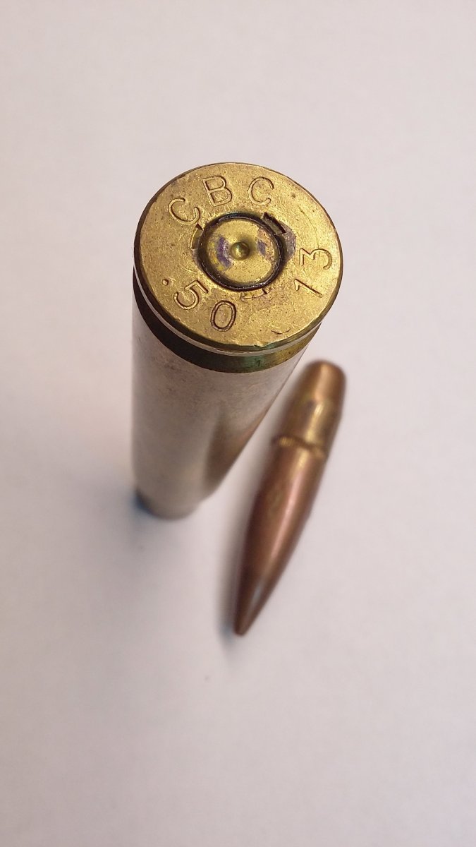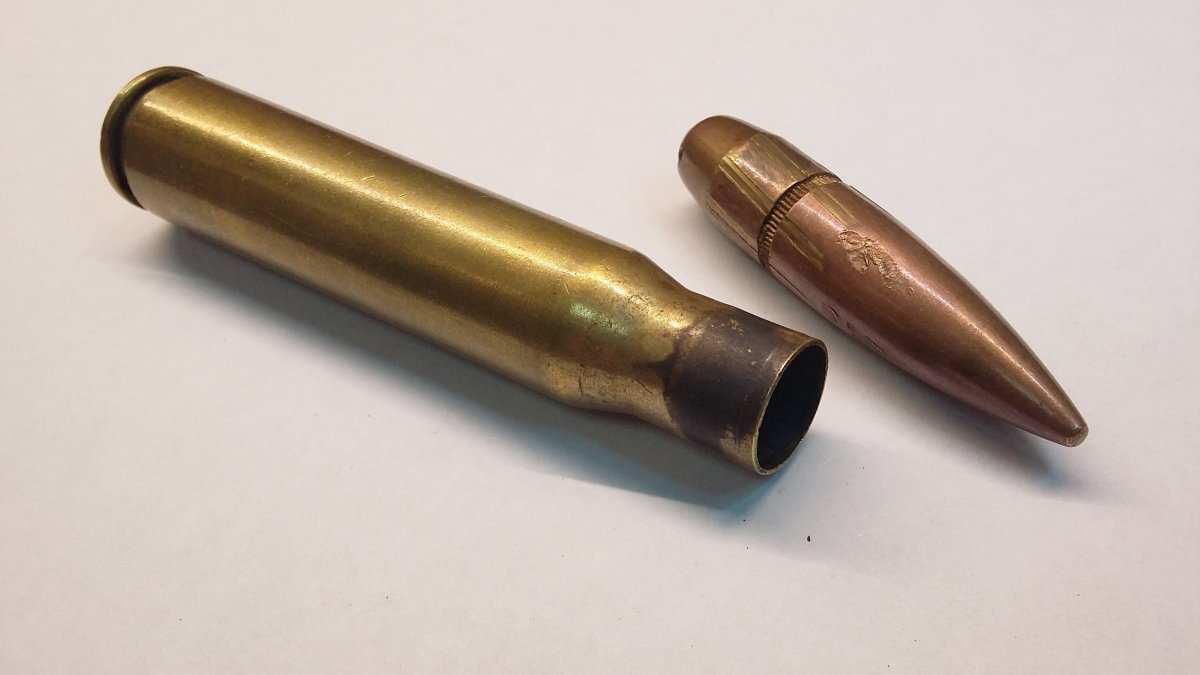 Сборный ммг патрона .50 BMG (12.7х99). Гильза латунь, стреляная, пуля прошла канал ствола. Внутри пусто, не сверленый.