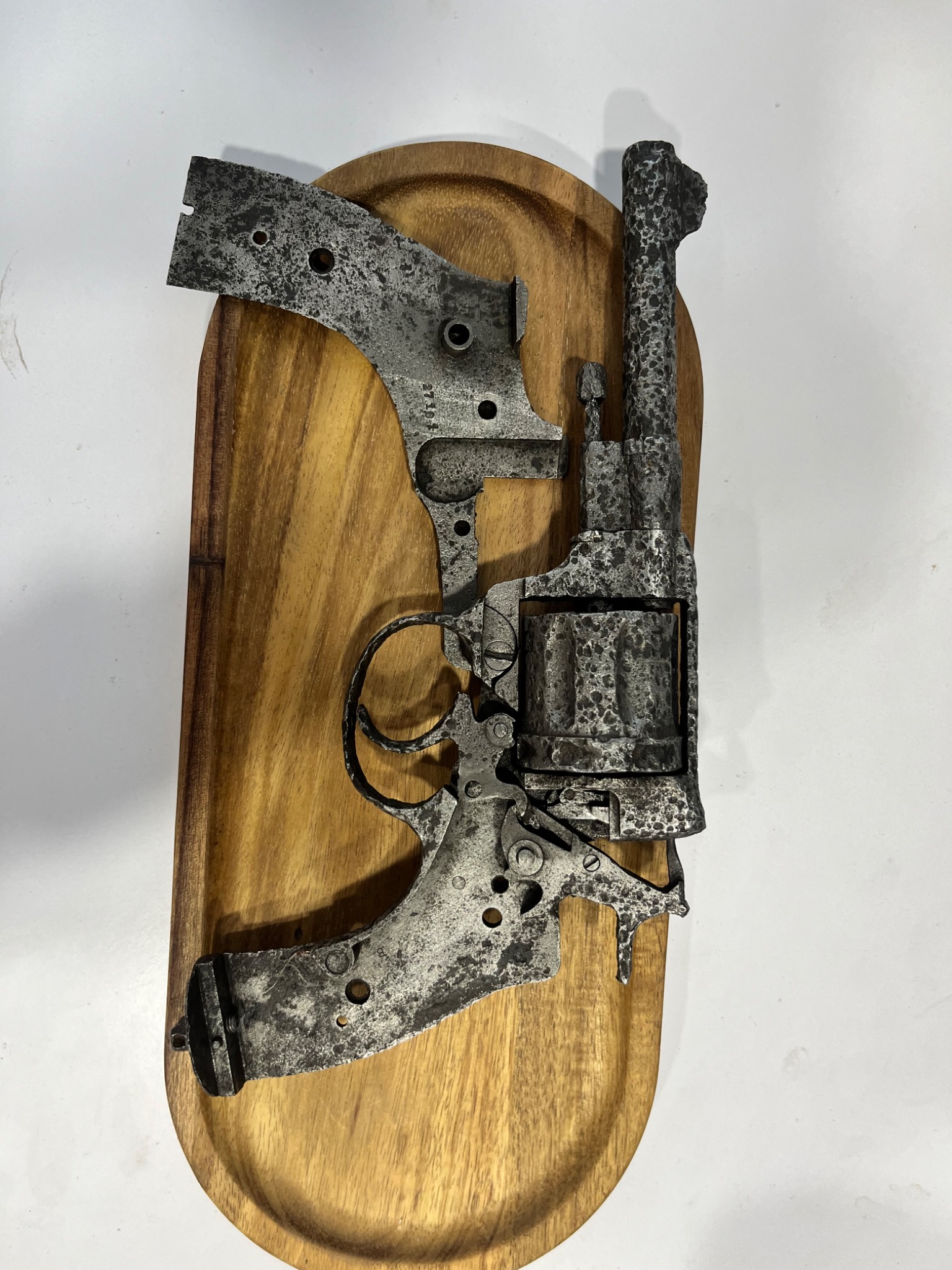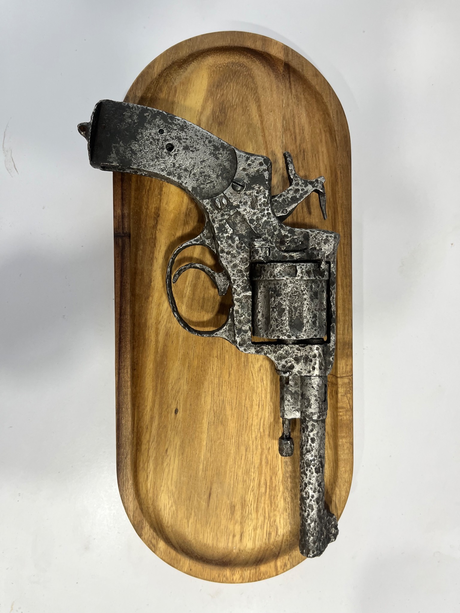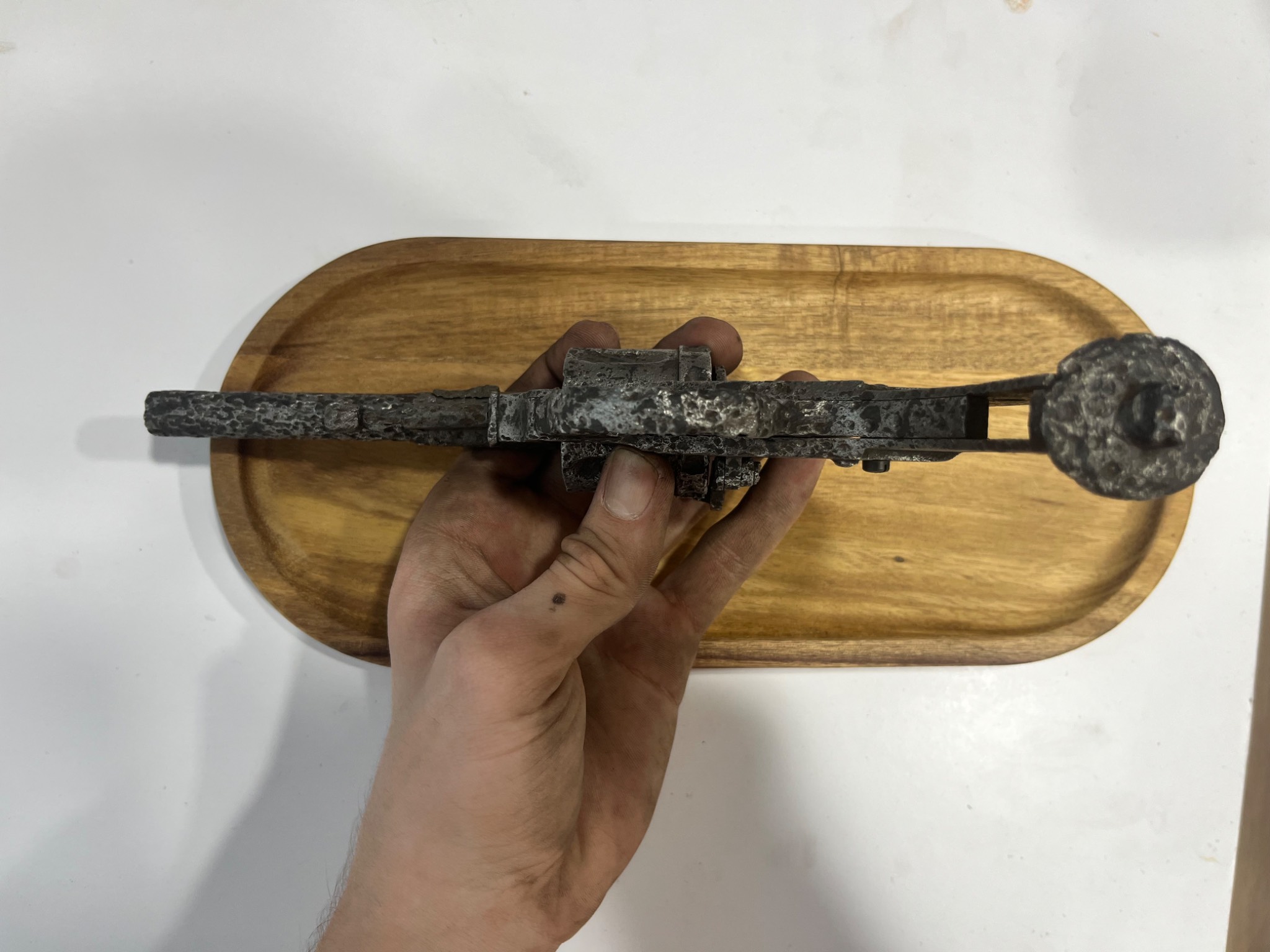 копанный наган, полностью почищенный и не имеет ржавчины, ствол полностью пустой как и 6 комор барабана( в одной осталась гильза которую не смогли достать) курок не обрезанный, кроме чистки ничего не делалось