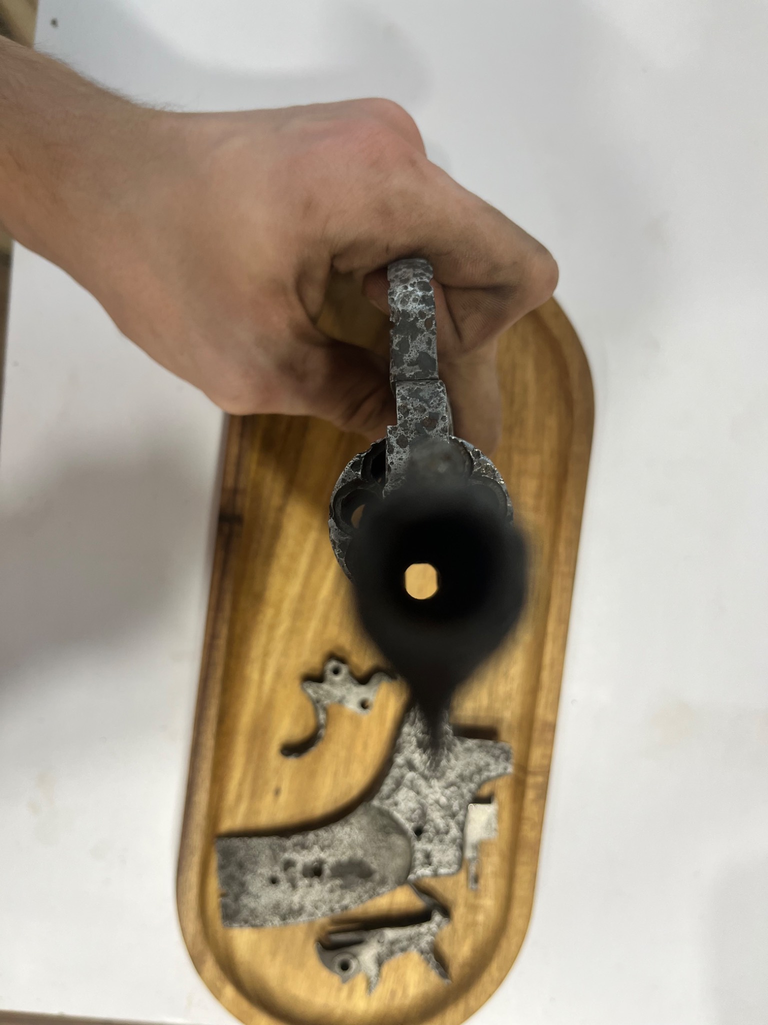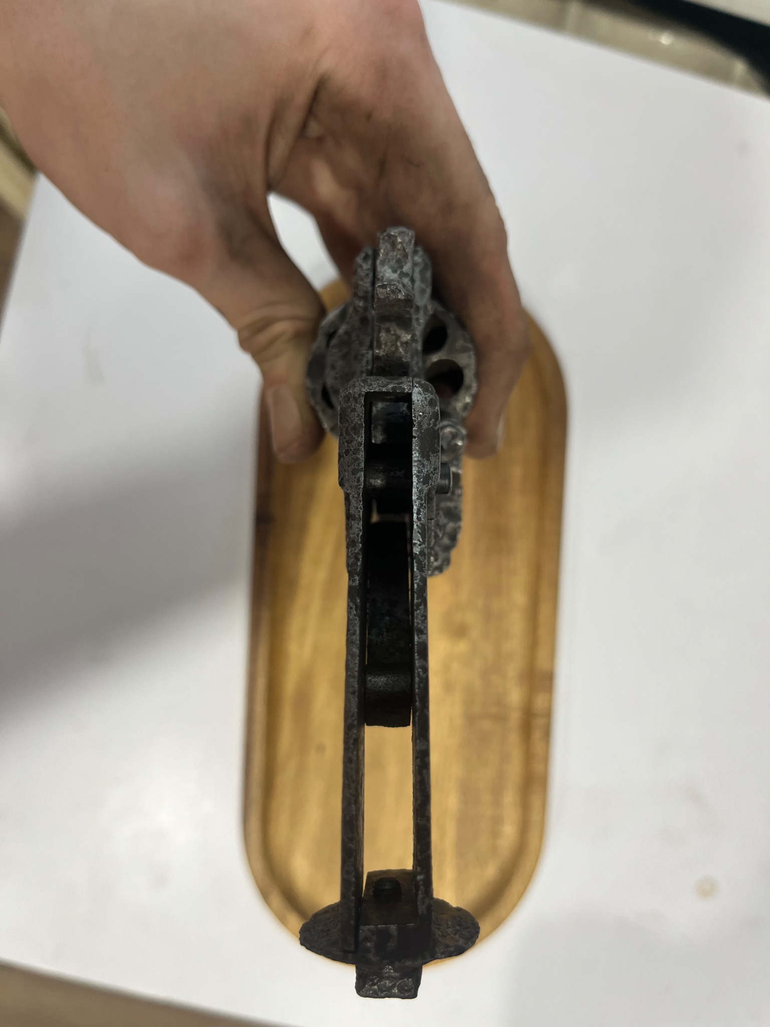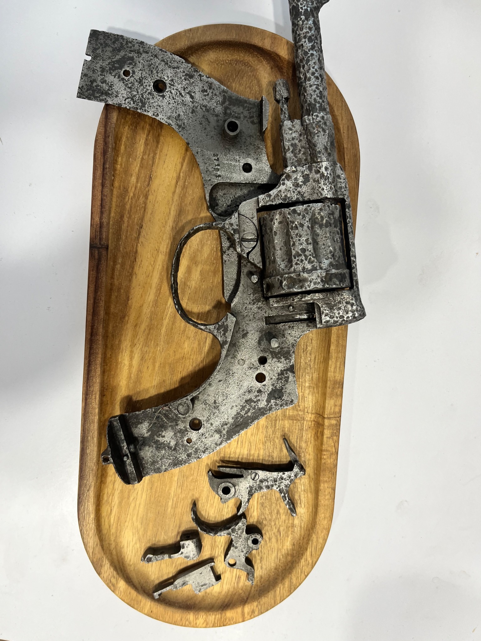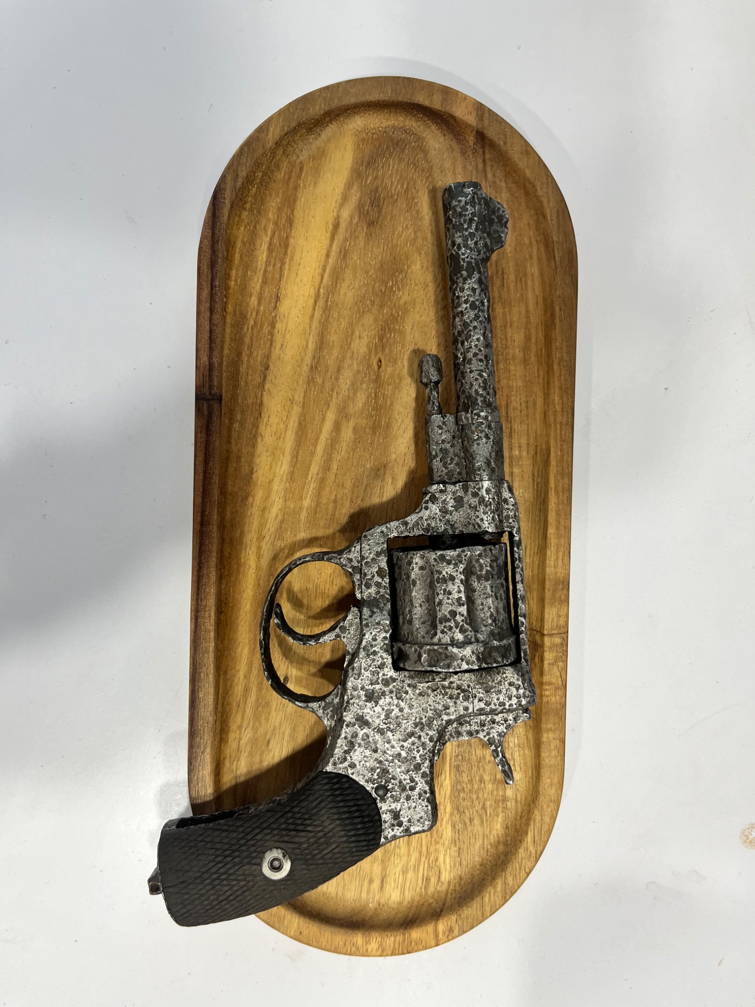 копанный наган, полностью почищенный и не имеет ржавчины, ствол полностью пустой как и 6 комор барабана( в одной осталась гильза которую не смогли достать) курок не обрезанный, кроме чистки ничего не делалось