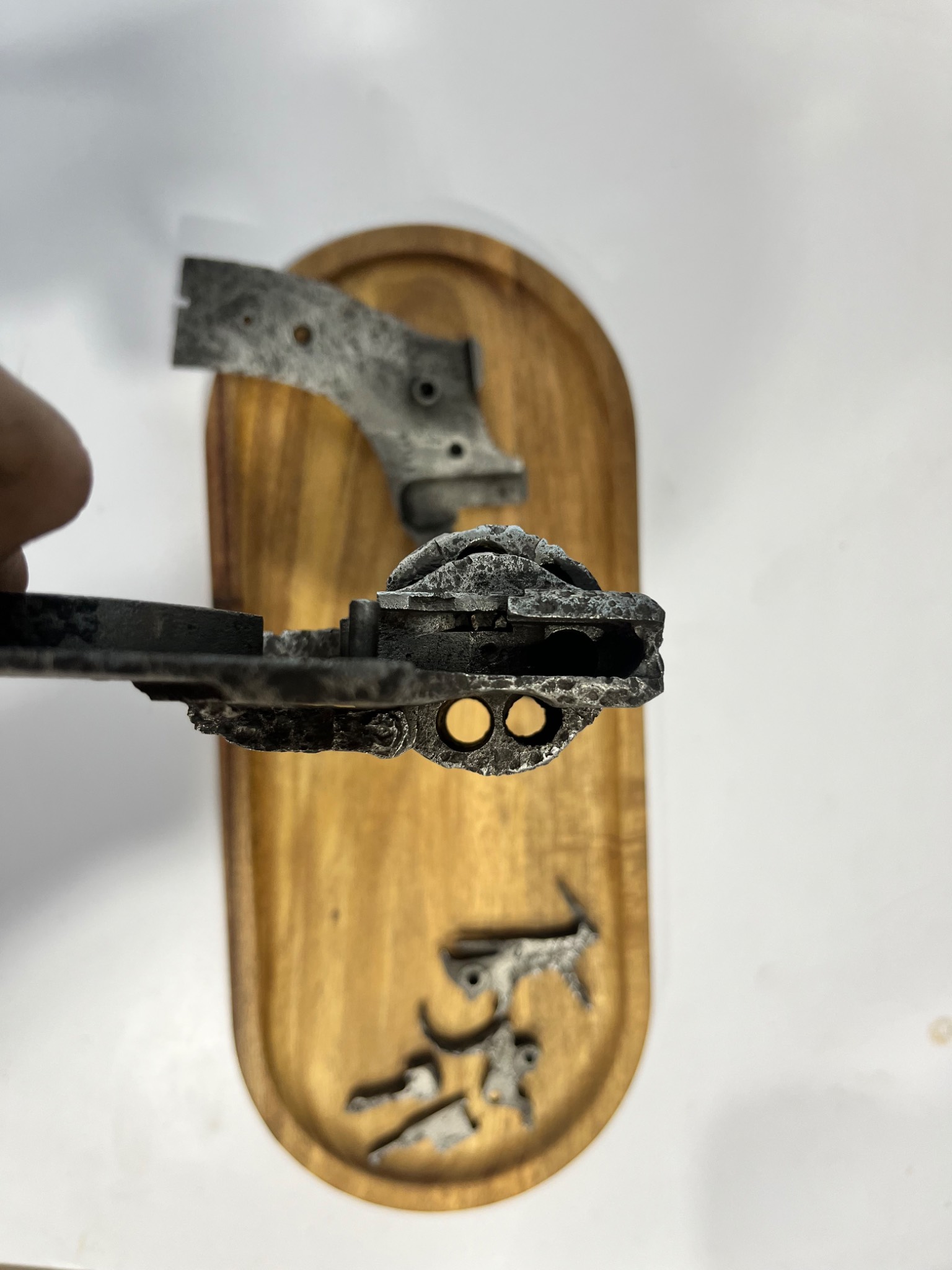 барабан крутится и сдвигается вперед( назад отпрыгивает также) но не получилось его достать, шомпол и шомпольная трубка не рабочие-это декоративный элемент, при разборке была отломана ось казеника