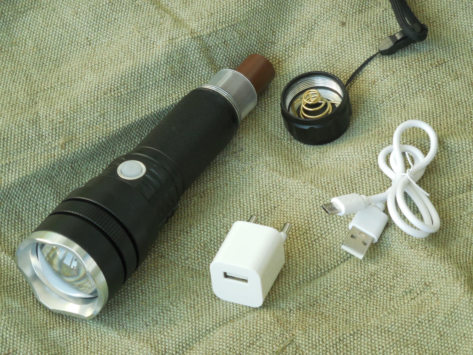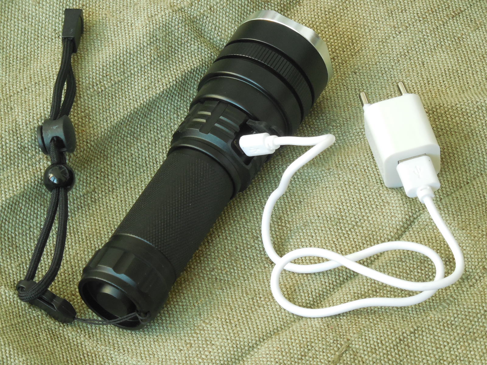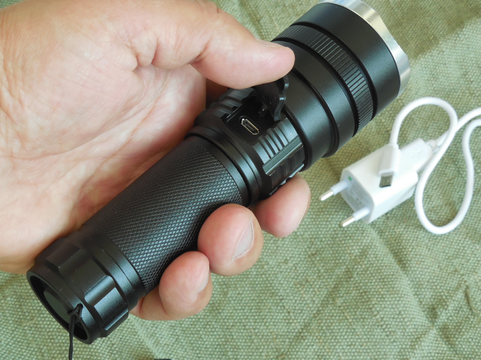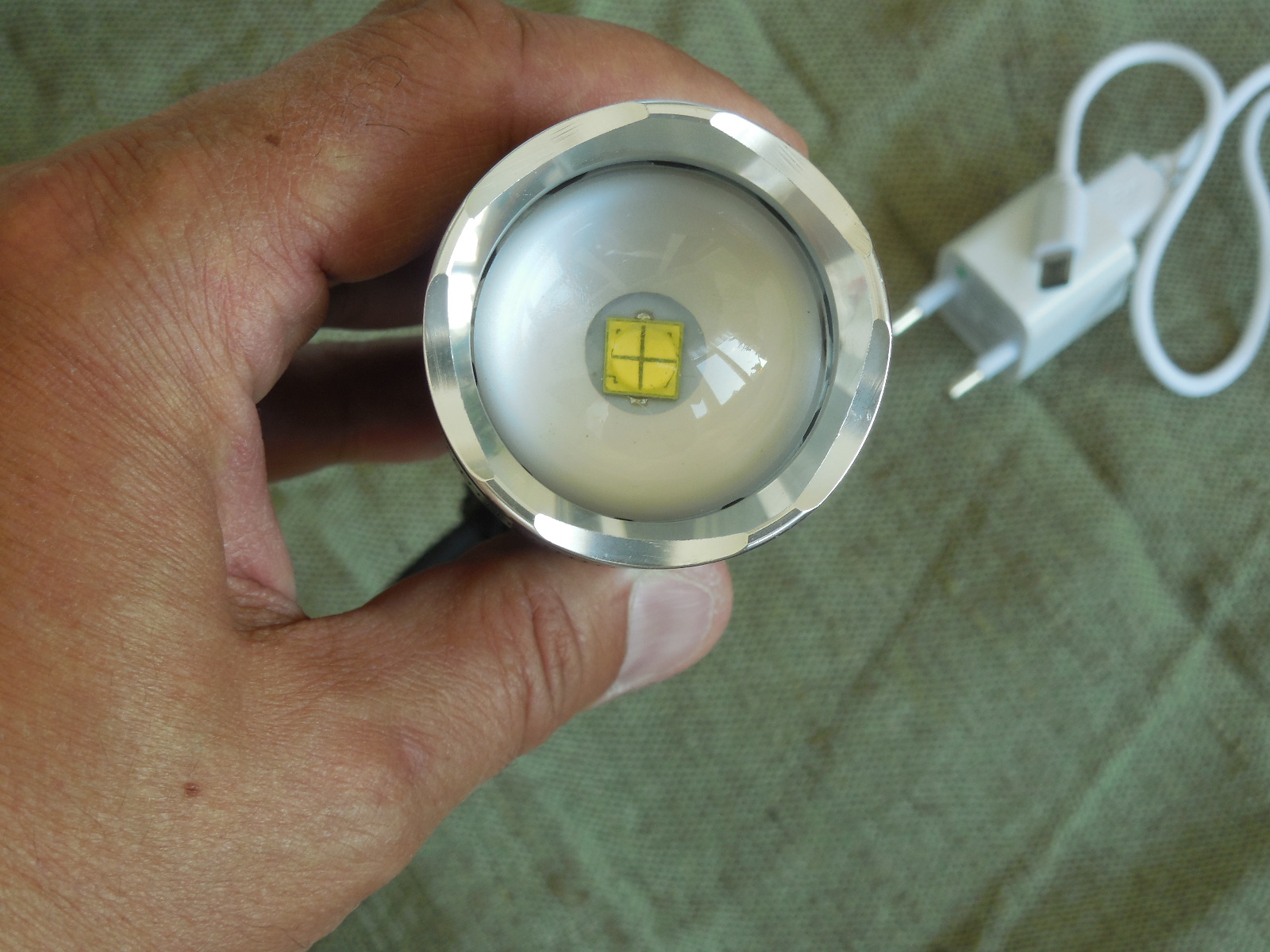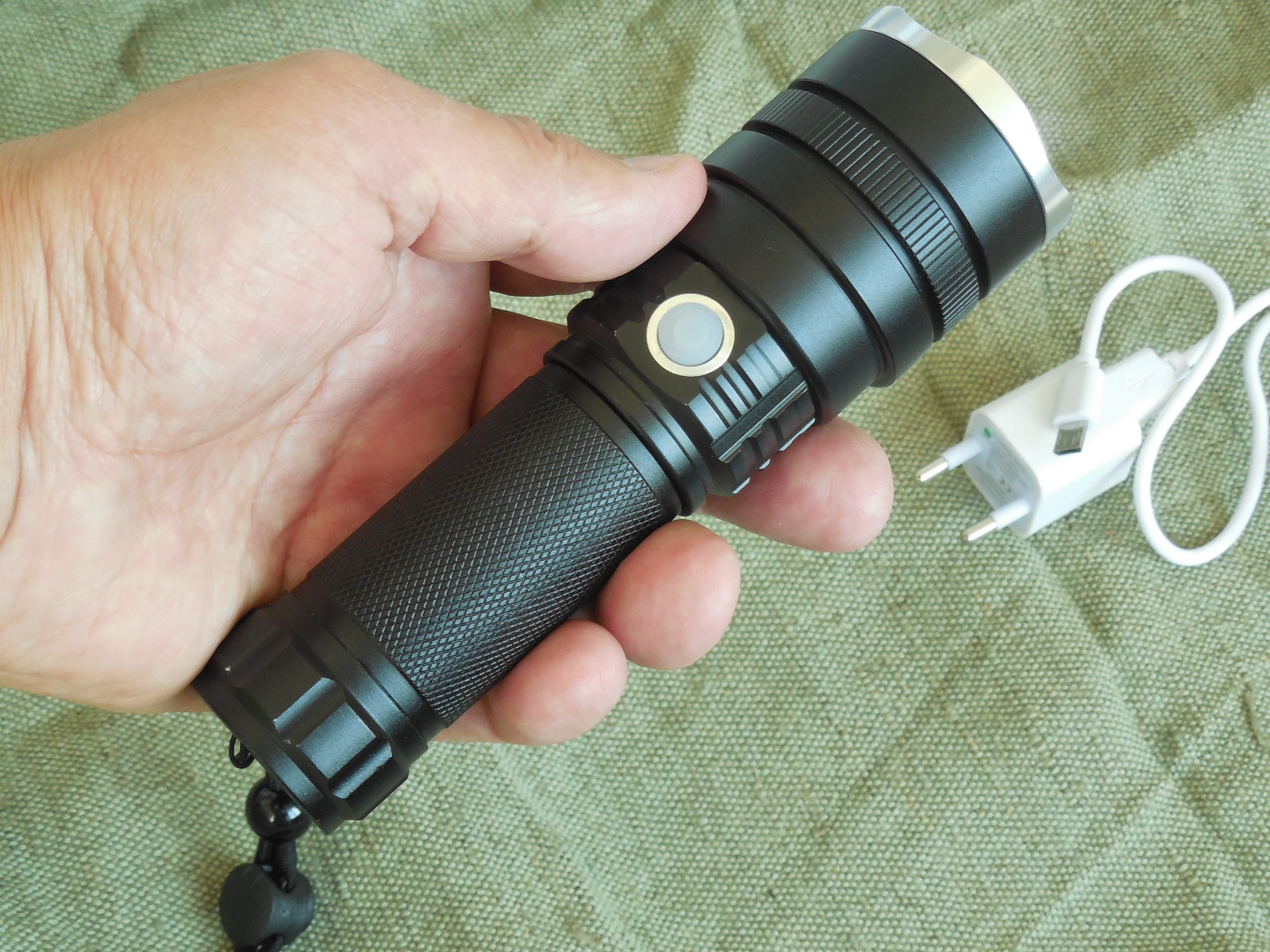 Ціна за Повний комплект 800 грн. Мощний дальнобойний пошуковий фонарь на світлодіоді CREE XHP50, Корпус ліхтаря виконаний з алюмінію, захищений від дощу. 2 режимів роботи: Максимальний, економ, стробоскоп, ( режими переключаються послідовно ), сама кнопка розташована традиційно для фонаря під великий палець, що дуже зручно. Фонарь ЛіНЗОВИЙ, Фокусується, ZOOM, Фокусована лінза ліхтаря дозволяє легко змінювати світло від широкої засвітки (висвітлює все навколо) до вузького і яскравого променя (що дозволяє висвітлювати предмети на значній відстані). дальність променя понад 200 м. Фокусування плавне і досить туге що б не збиватися від вібрацій. Фокусування променя проводиться переміщенням головної частини "від себе". Якщо головна частина засунута, то промінь набуває широкої засвітки, що зручно, наприклад, для піших або велопрогулянок. Заряджається по принципу мобільного телефона, невиймаючи аккумулятор з ліхтаря. Індикатором статусу зарядки: якщо горить червоний - проводиться зарядка, якщо зелений - зарядка завершена. і нова функція, статус розряда фонаря: коли фонарь заряджений, індикатор світить-зеленим, а коли сідає аккум, індикатор починає блимати червоним. Індикатором являється зелена кнопка, що включає і виключає фонарь, сама кнопка розташована традиційно для фонаря під великий палець, що дуже зручно. Фонарь працює на Li-on аккумуляторі формата 26650 і 18650, дана модель фонаря іде в комплекті з аккумулятором 18650. Зарядка від USB допоможе зарядити ліхтар по дорозі на відпочинок. Комплектація все що на фото: Фонарь, зарядка 220в. 1 шт-аккумулятор Li-on 18650 на 4,2 вольта, на 2700 mAh, перехідник з 26650 на 18650.