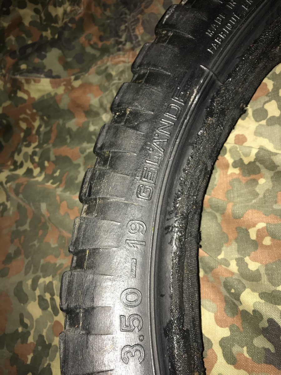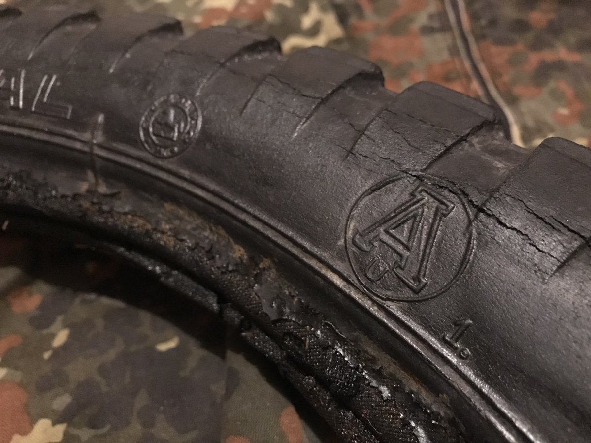 Добрый день уважаемые камрады. Вашему вниманию предлагаю покрышку Continental 3.50-19 от тежелых мотоциклов вермахта, клейм очень много. На фото периода войны , на мотоцикле , запаска идентичная этой. Состояние по фото. Найдена в болоте, поэтому и сохранилась неплохо на свои года. В теме обсуждения есть фото с копа. Данная покрышка отлично подойдет на запаску , или в музей. Резина мягкая и прочная, так что возможно и реставрировать её . Удачных торгов. С уважением Максим! Ссылка на обсуждение https://reibert.info/threads/moto-shina-continental-s-bolota.1073184/