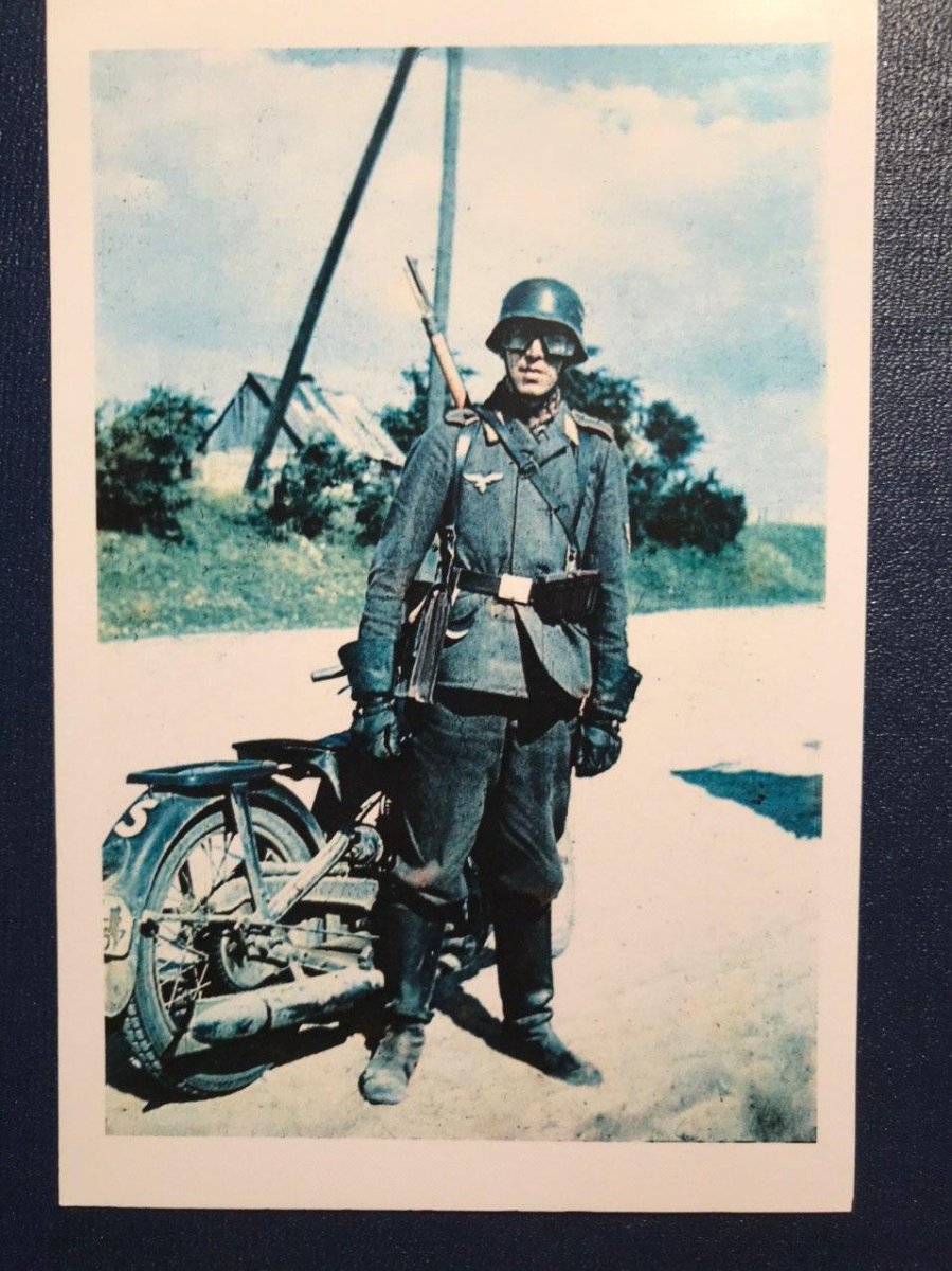 Мотоциклист вермахта в защитных очках со своим мотоциклом.