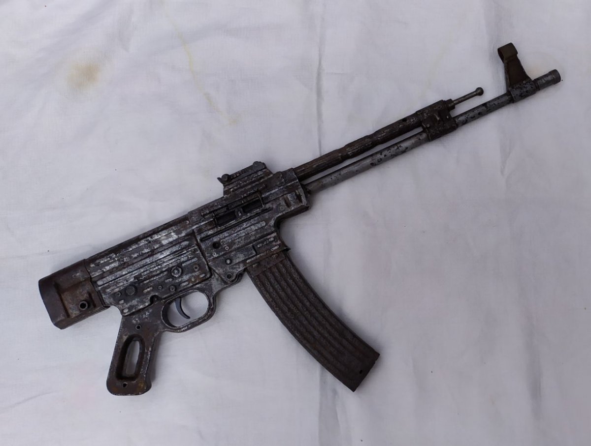 В земле не был.Найден на дне блиндажа,одна сторона соприкасались с полом.Внутри хорошее состояние,УСМ полностью функционален.Деактв ствола,2 отверстия и шплинт,ударник в затворе отсутствует.Магазин с маркировкой МКБ42,ВНУТРИ ПУСТОЙ.любые доп фото по запросу.Вопросы пожалуйста в личку.Обсуждение у нас на форуме.