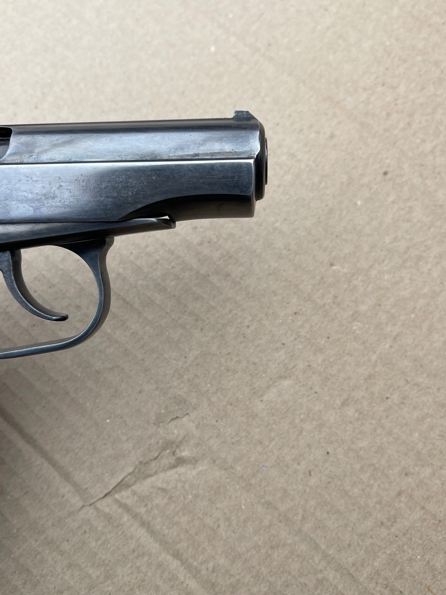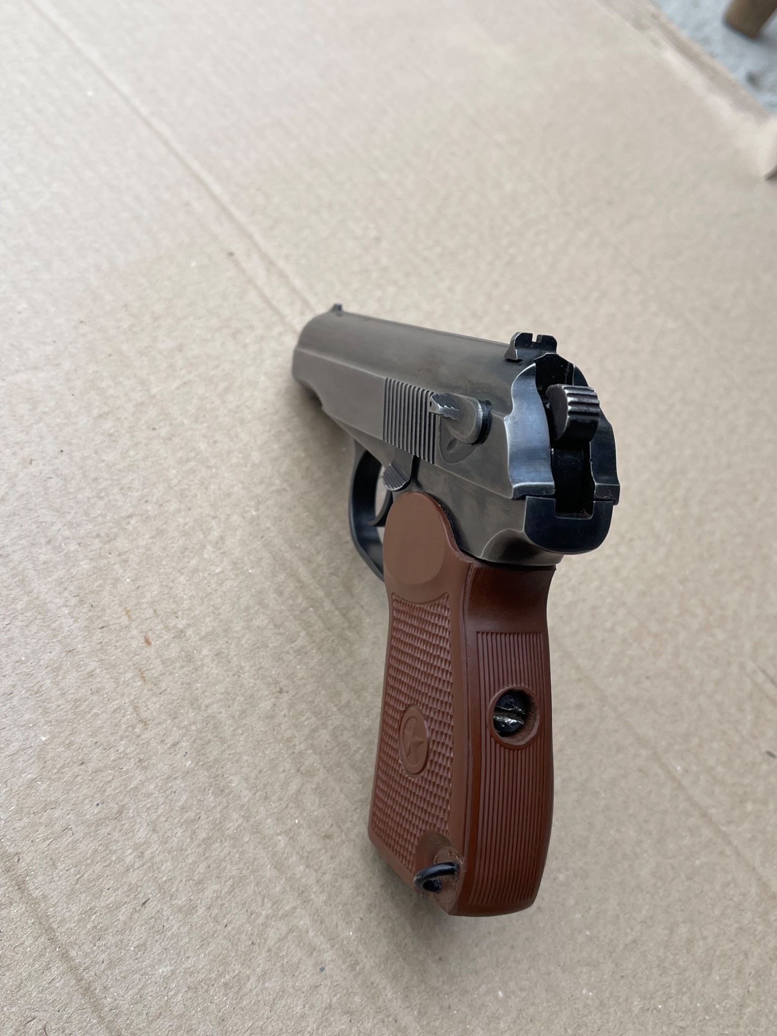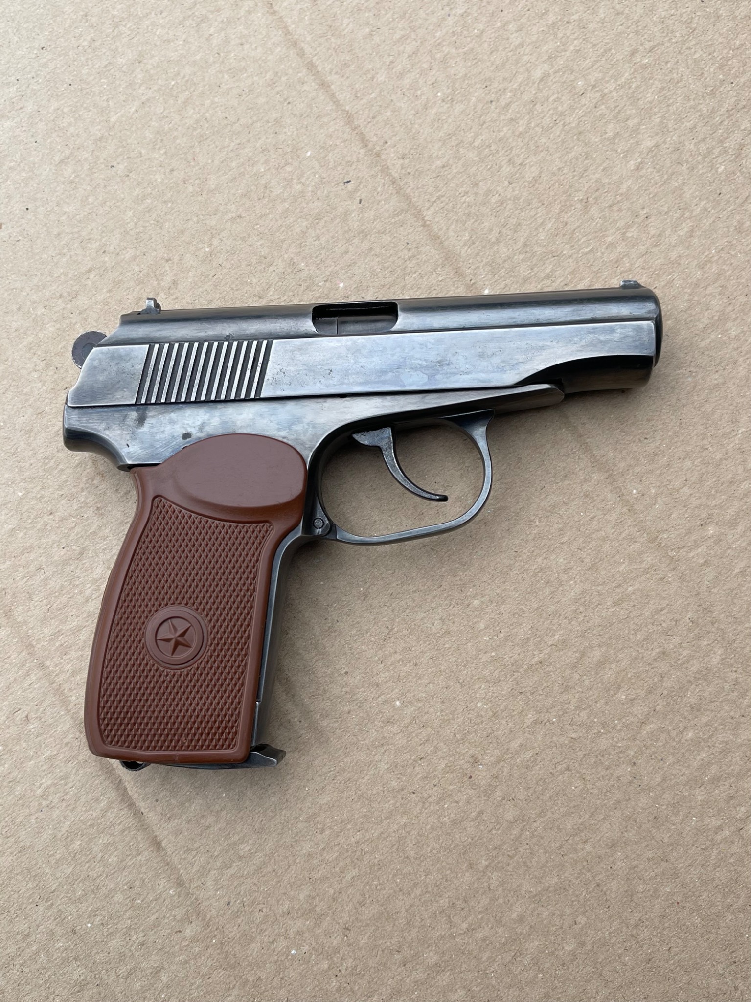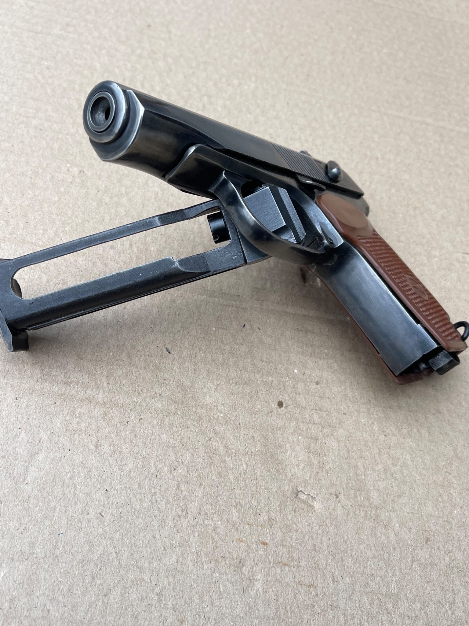 Пневматичний пістолет МР-654к 28-ї серії, в легкому тюнінгу,наварена борода,підігнана пластикова рукоятка,перемички не видалені повністю, тільки обточені, прихований притискний гвинт магазину, обточена пятка магазина,обточена спускова скоба, дульний зріз під 9мм, в принципі все видно на фото,магазин не перевіряли скоріш за все потрібна ревізія.