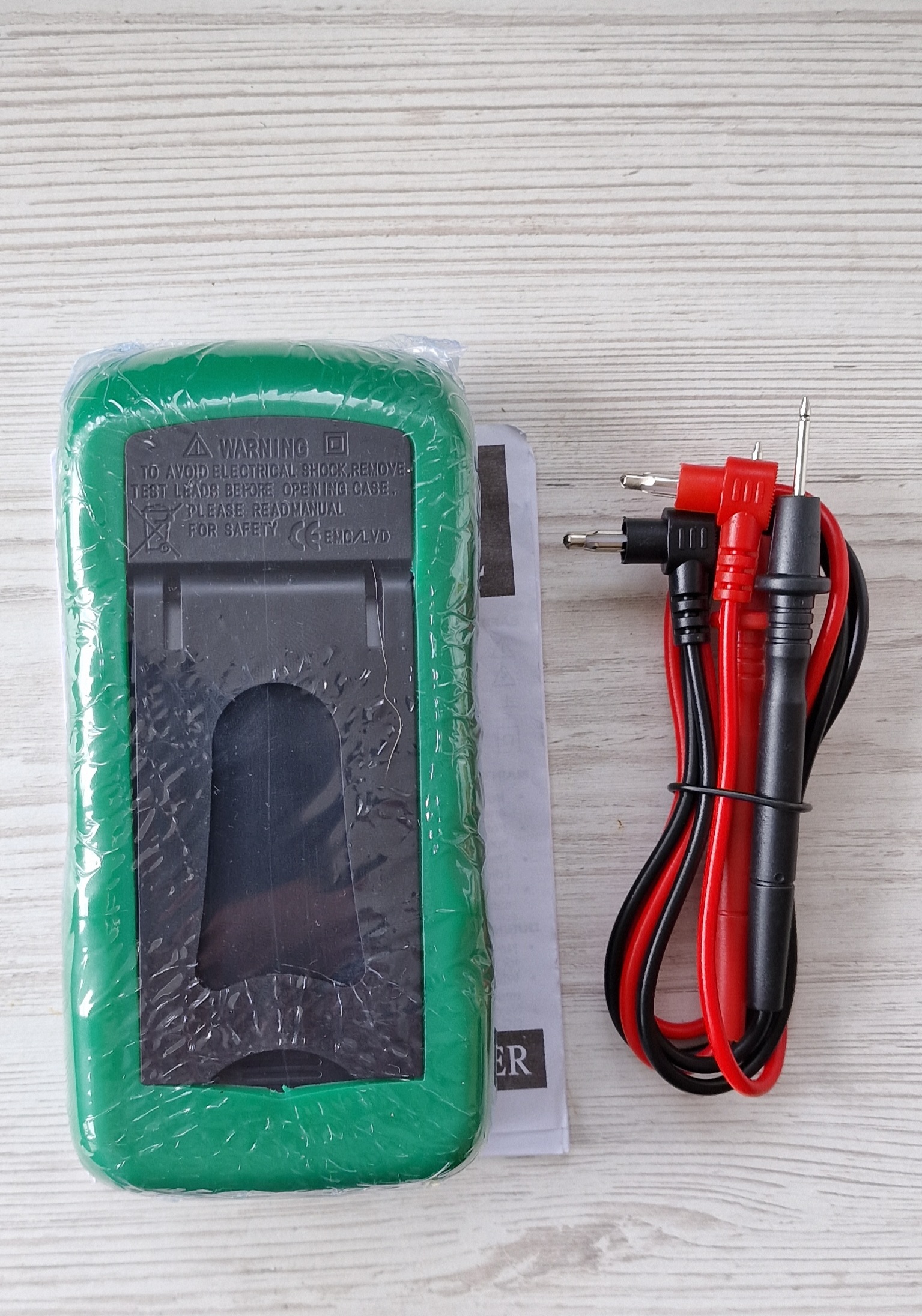Мультиметр живиться від 9В батарейки (крона). Ззаду має зручну підставку. Комплектація: мультиметр, щупи, інструкція.