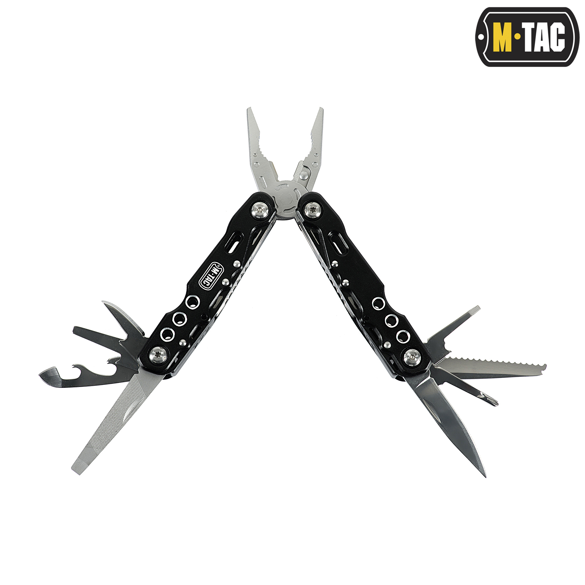 Мультитул имеет много полезных инструментов: нож, плоскогубцы с приспособлением для снятия изоляции, острогубцы, крестообразную отвертку, большую плоскую отвертку, маленькую плоскую отвертку, консервный нож, открывалку для бутылок и банок, ножовку, напильник и шило. Все элементы плотно фиксируются в открытом и закрытом положении. Благодаря эргономичным формам, мультитул отлично лежит в руке и не соскальзывает во время работы. На рукояти нанесен стильный логотип бренда.