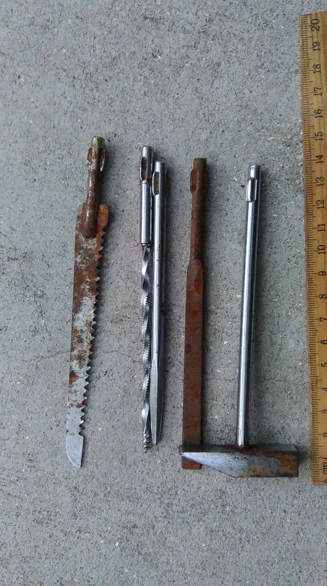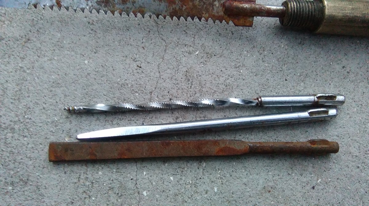 Ручка латунь(из минусов нет гайки фиксации). Молоток, сверло, пила, рашпиль, пробойник