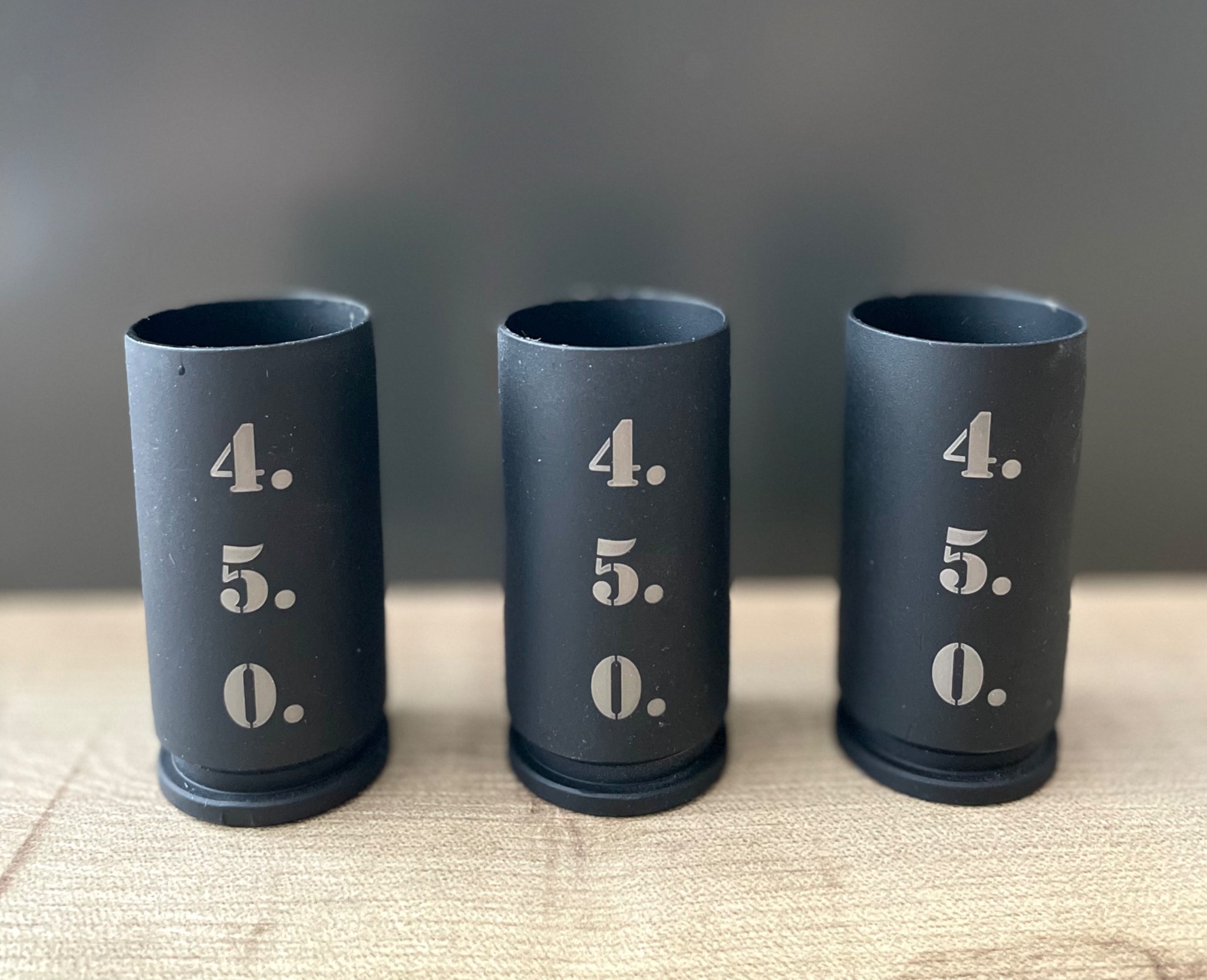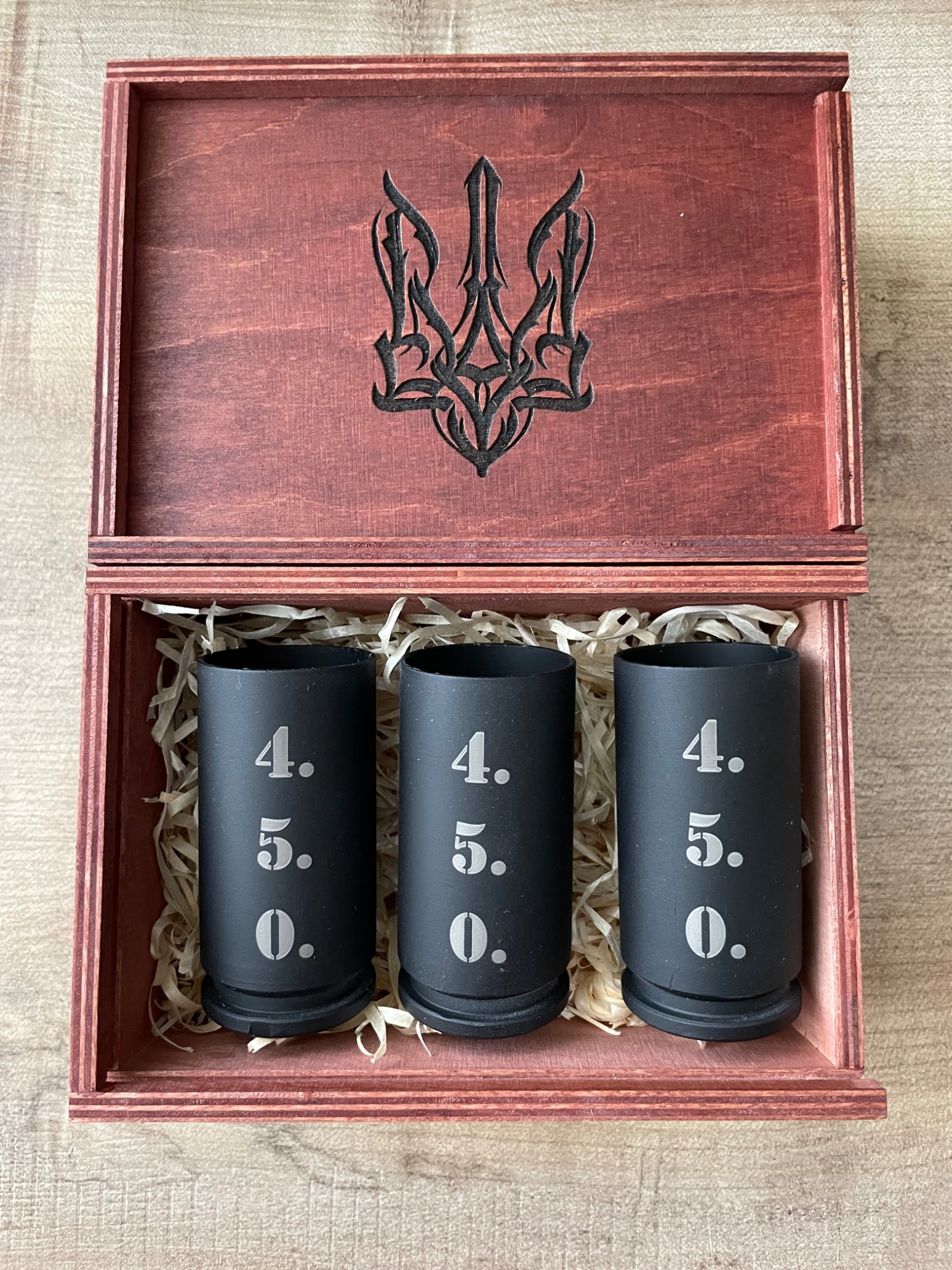 Набір сувенірних шотів, зроблених з гільз від 30 мм снаряду бойової броньованої машини БМП-2 в подарунковій скриньці.