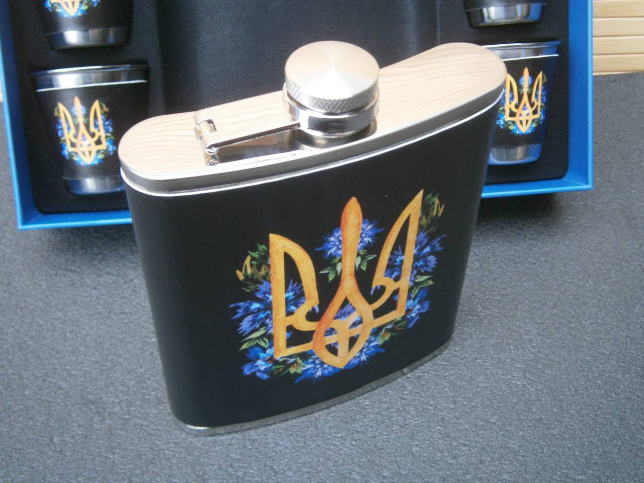 Набір подарунковий Тризуб фляга 530 мл з чарками 70 мл та лійкою нержавіюча сталь