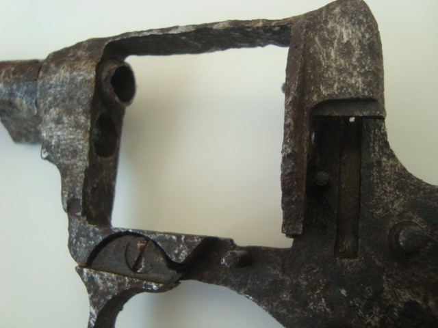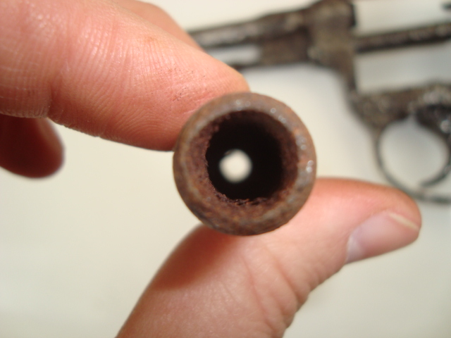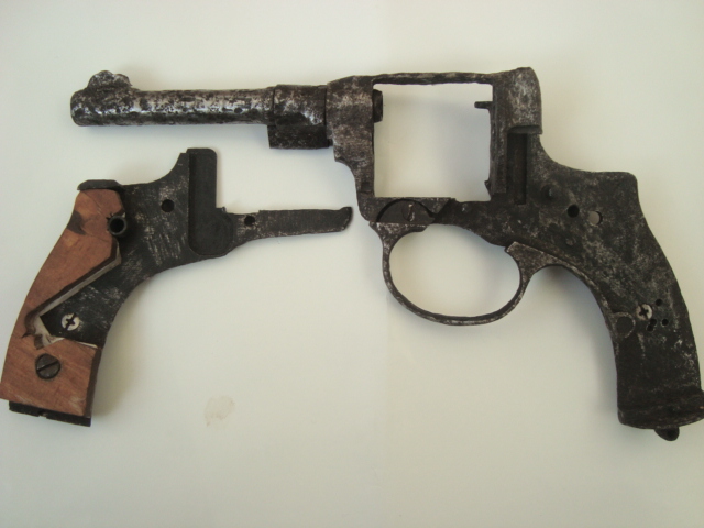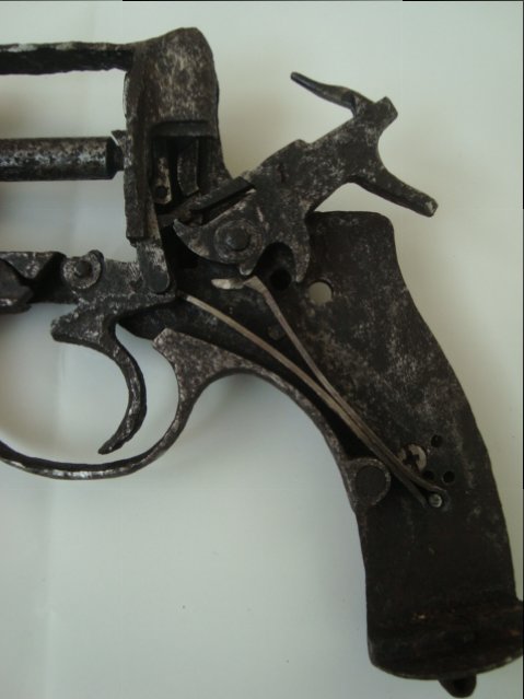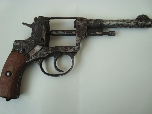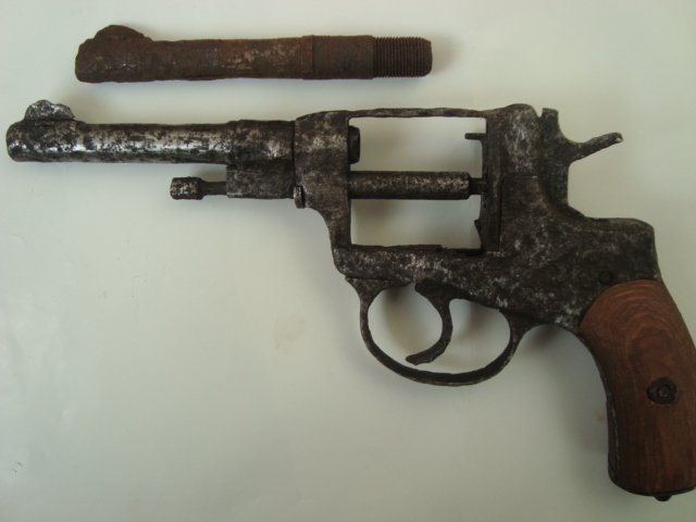З часів Другої світової. Копаний. Всередині чіткий серійний номер. На деяких деталях клейма та залишки вороніння. Зовні - залишки зірки. Бойова пружина саморобна. Решта частин всі від одного крім ствола. Курок повністю працює. УСМ повністю нормально клацає як з попереднім зведенням курка так і самовзводом (у тому числі перевіряв з барабаном). Ствол всередині не чистився.