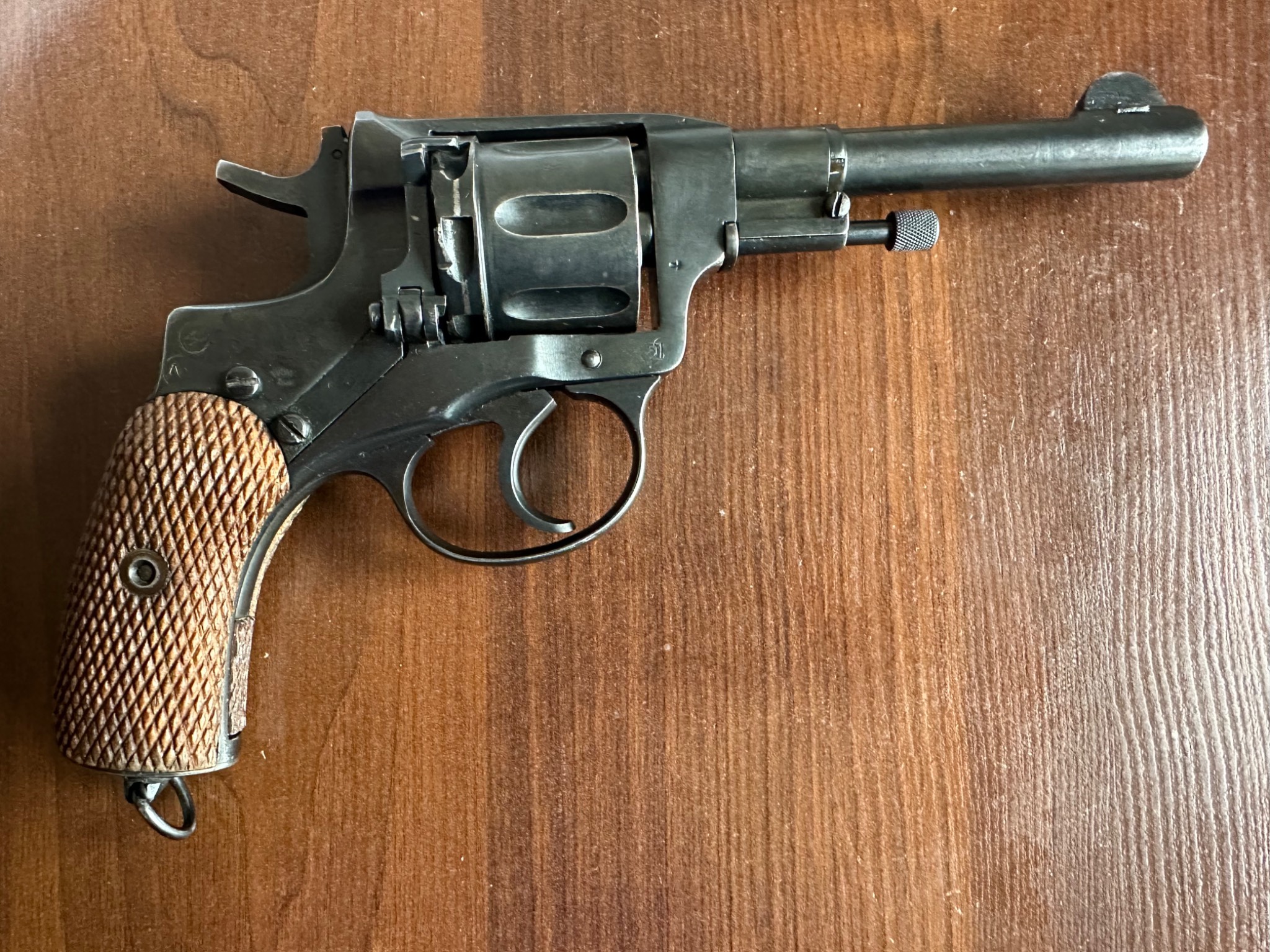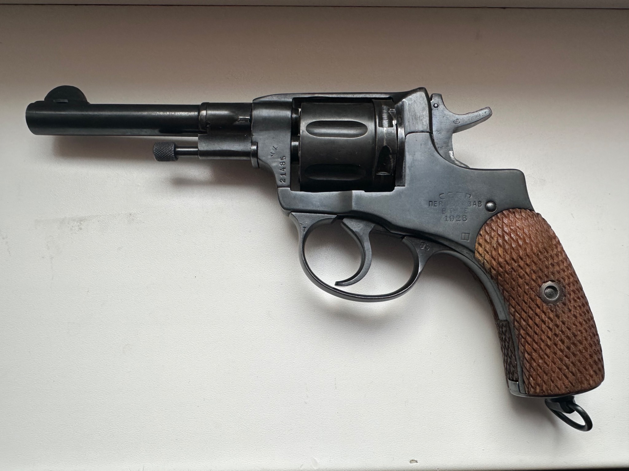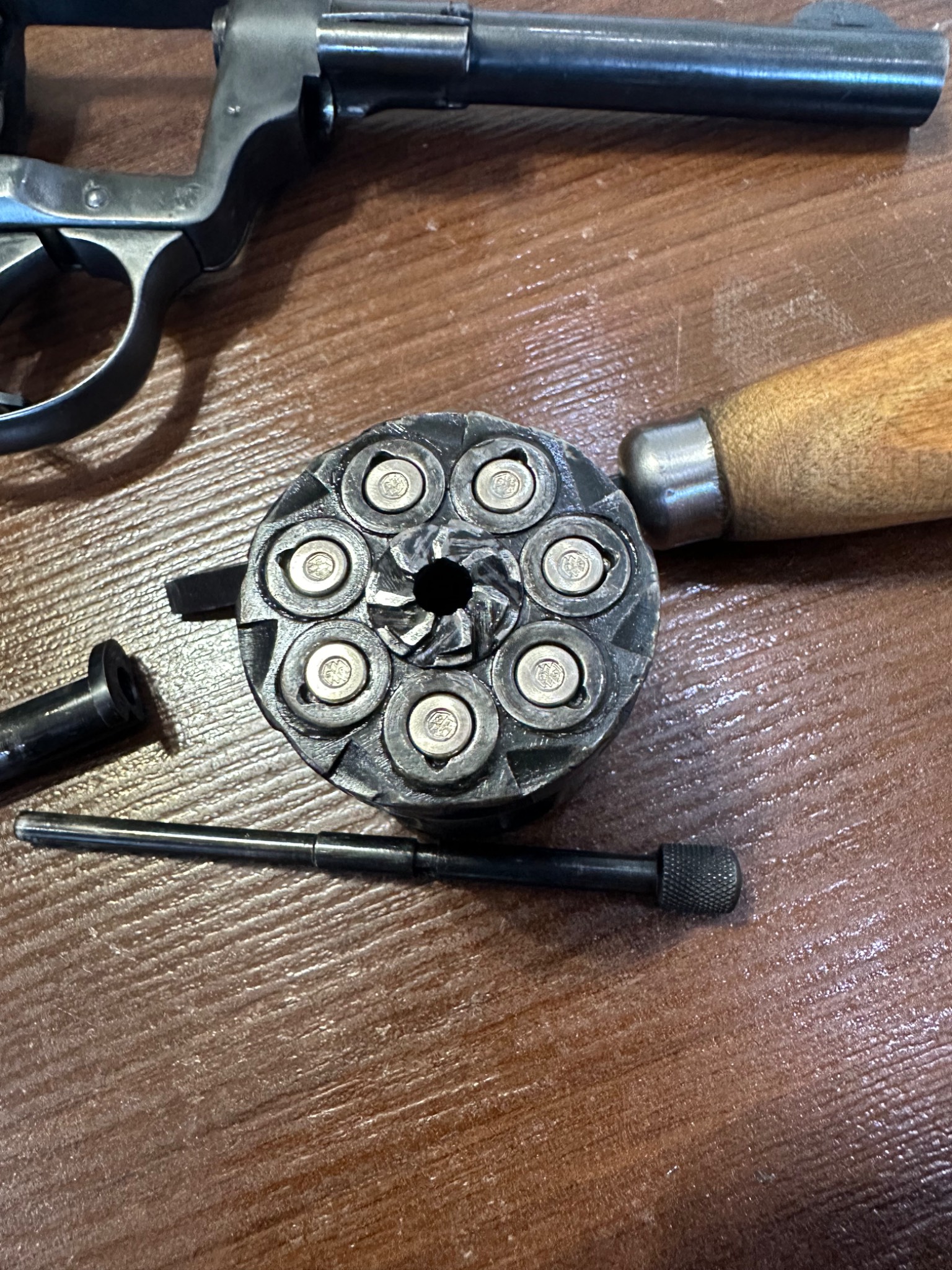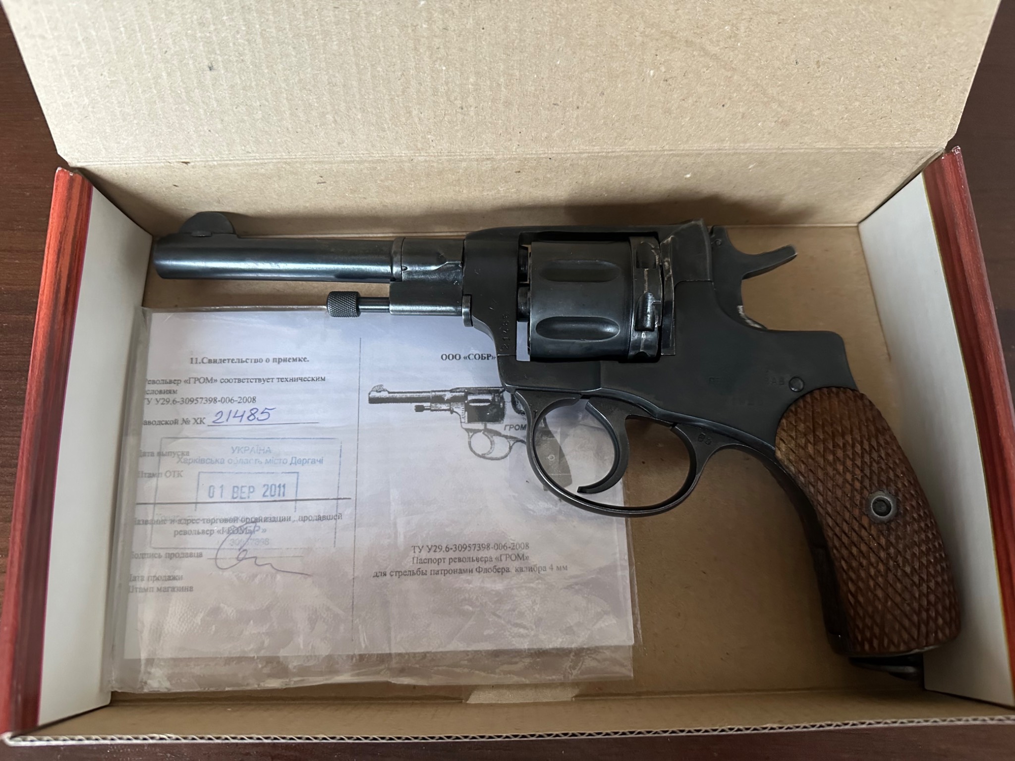 Наган Гром 1928 производства СОБР, почти все детали на молотках, ствол в родном калибре, на дульном срезе видны нитки, в стволе лейнер нарезной 4 мм, все каморы одного диаметра, скорость полета пули 300 м/с есть тесты через хронограф.