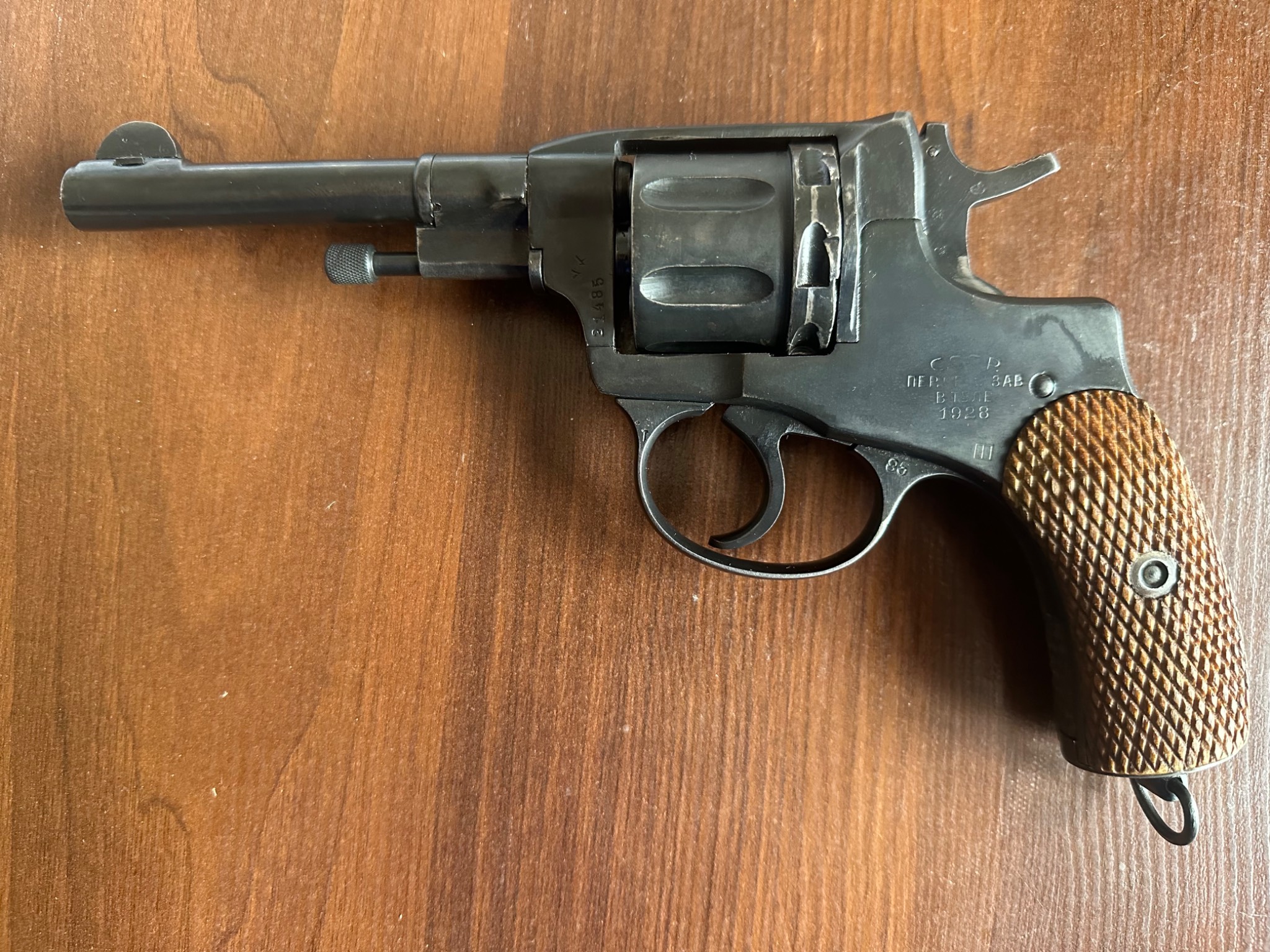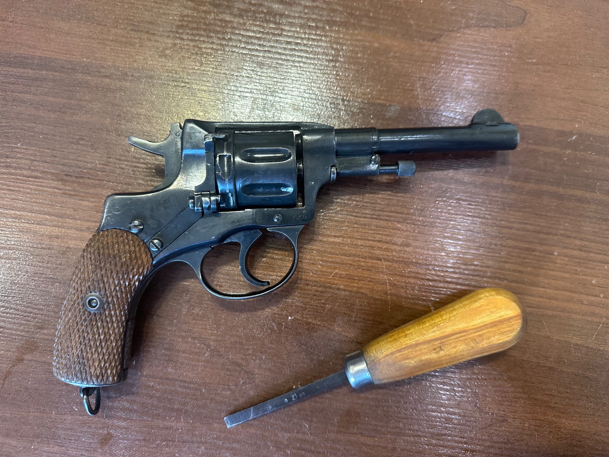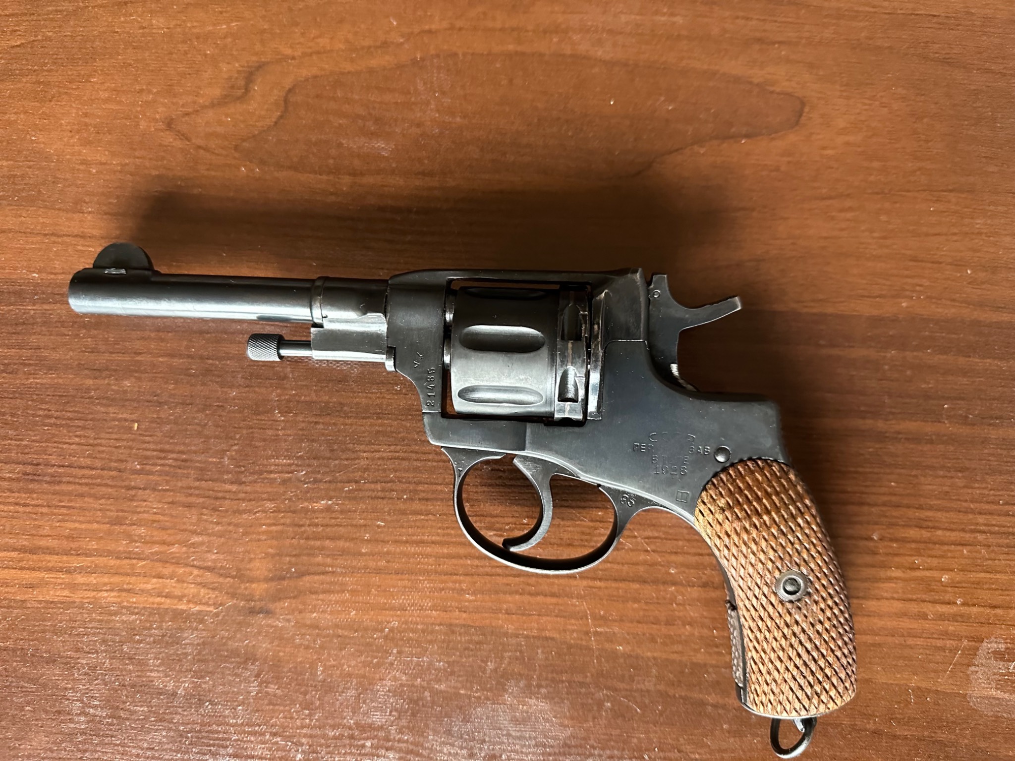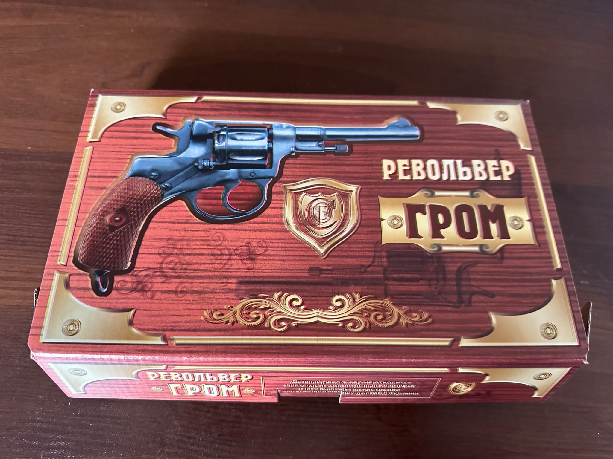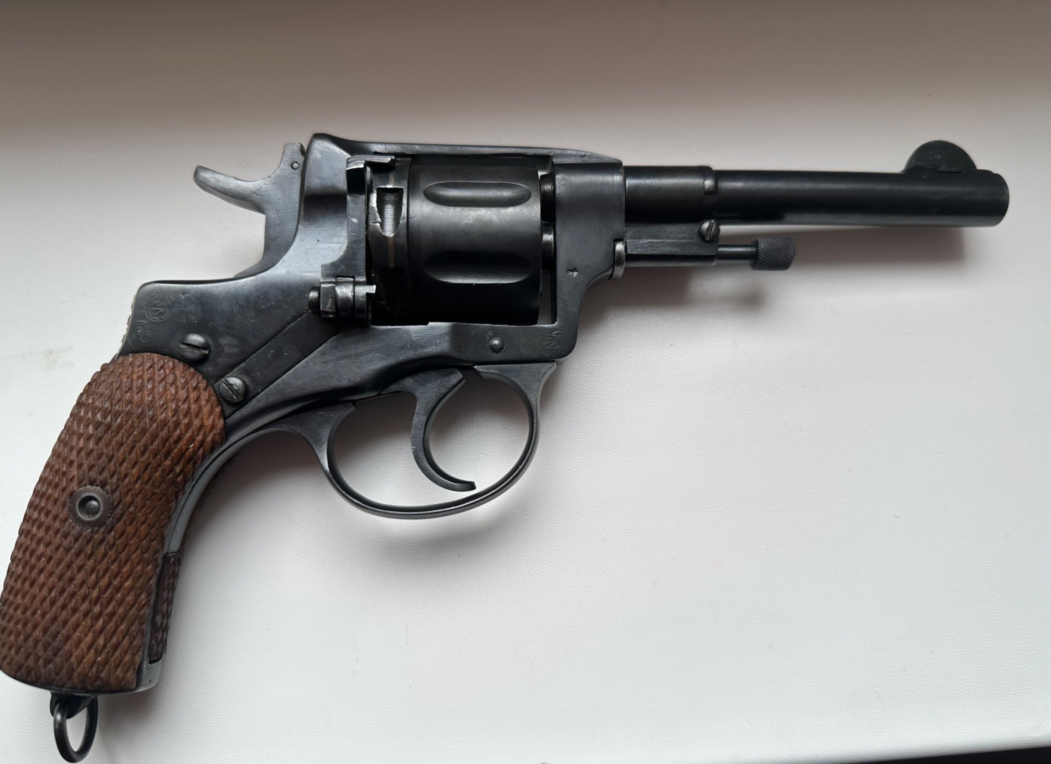 Наган Гром 1928 производства СОБР, почти все детали на молотках, ствол в родном калибре, на дульном срезе видны нитки, в стволе лейнер нарезной 4 мм, все каморы одного диаметра, скорость полета пули 300 м/с есть тесты через хронограф.