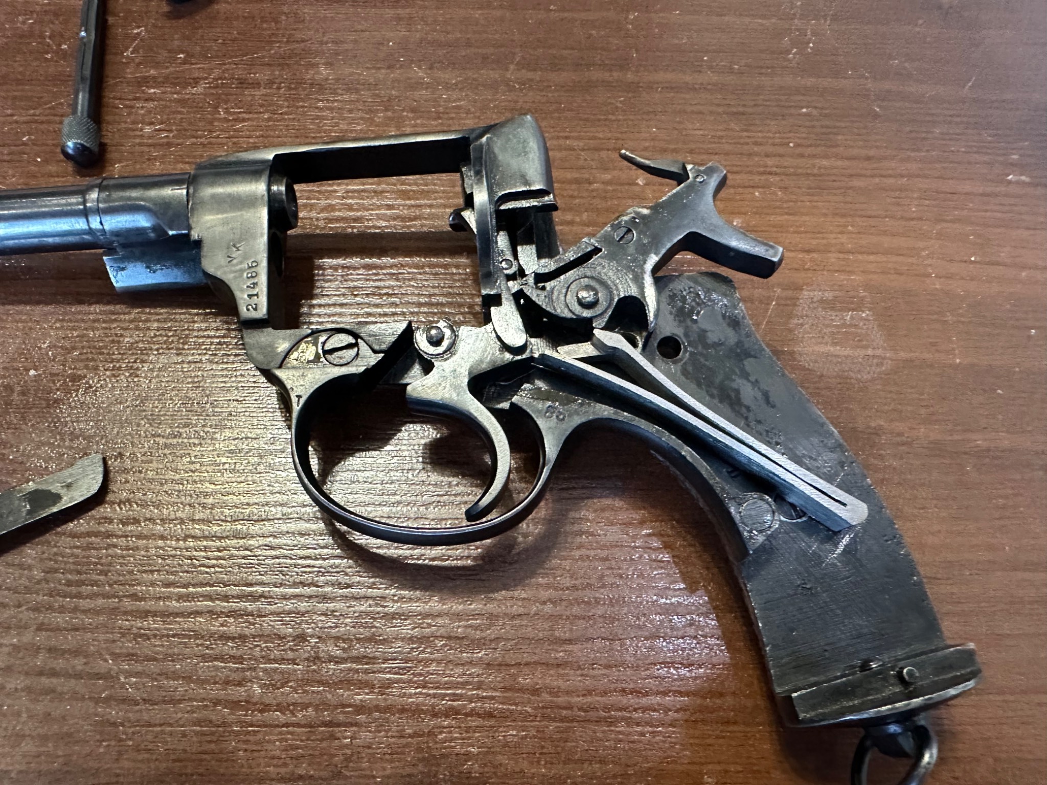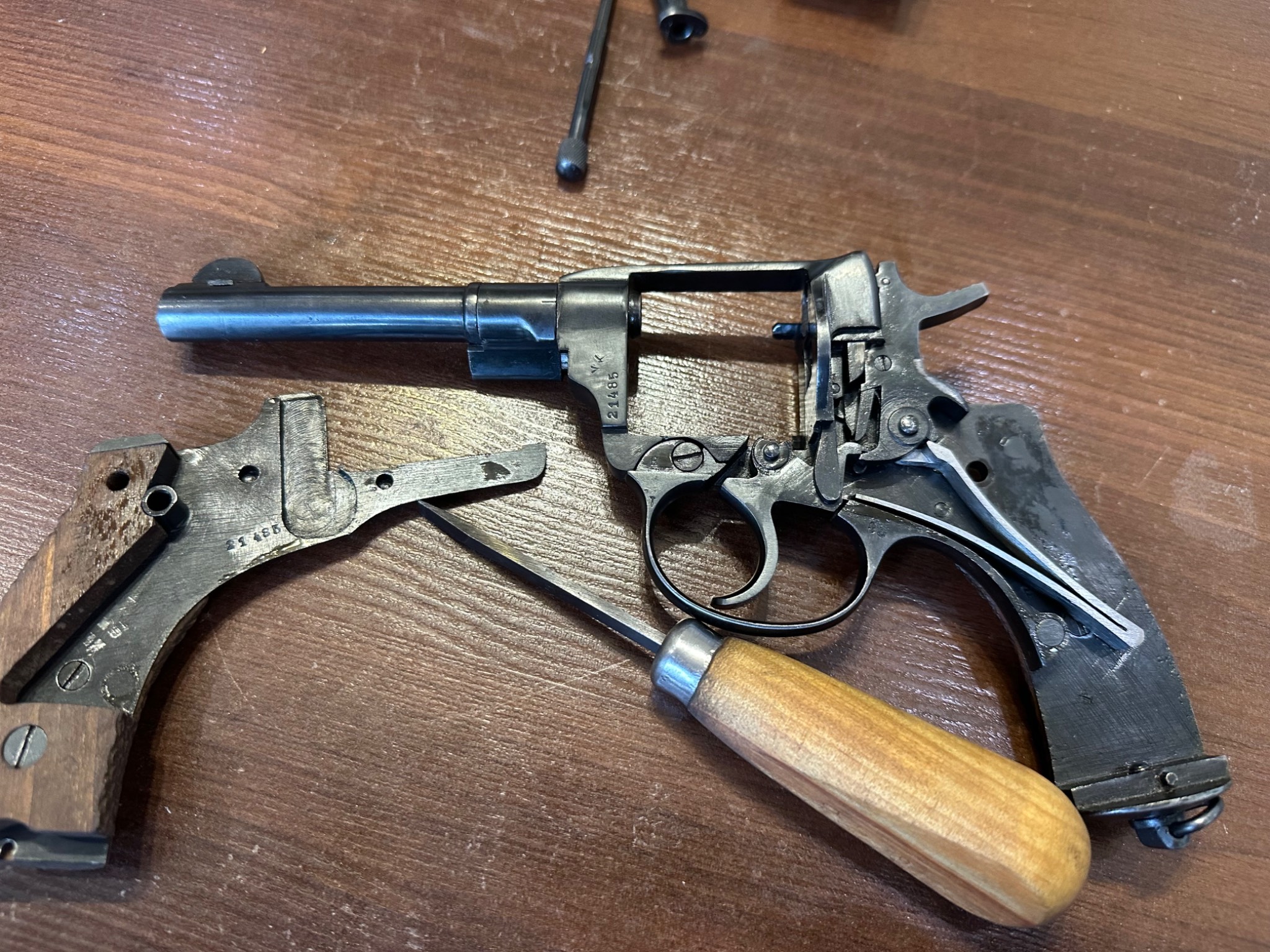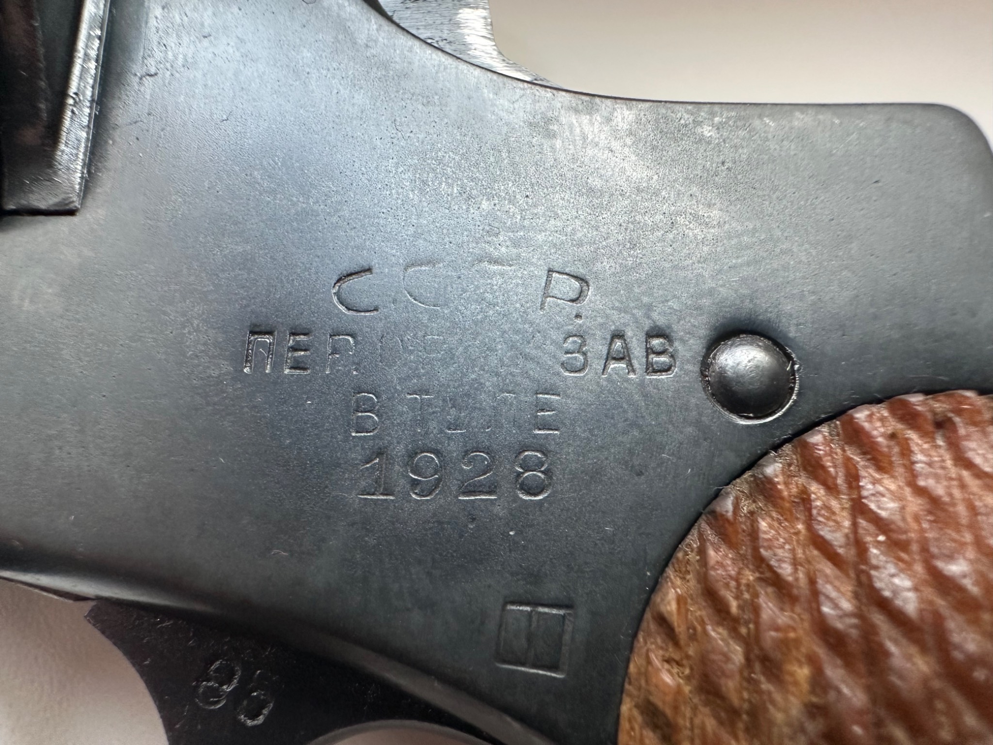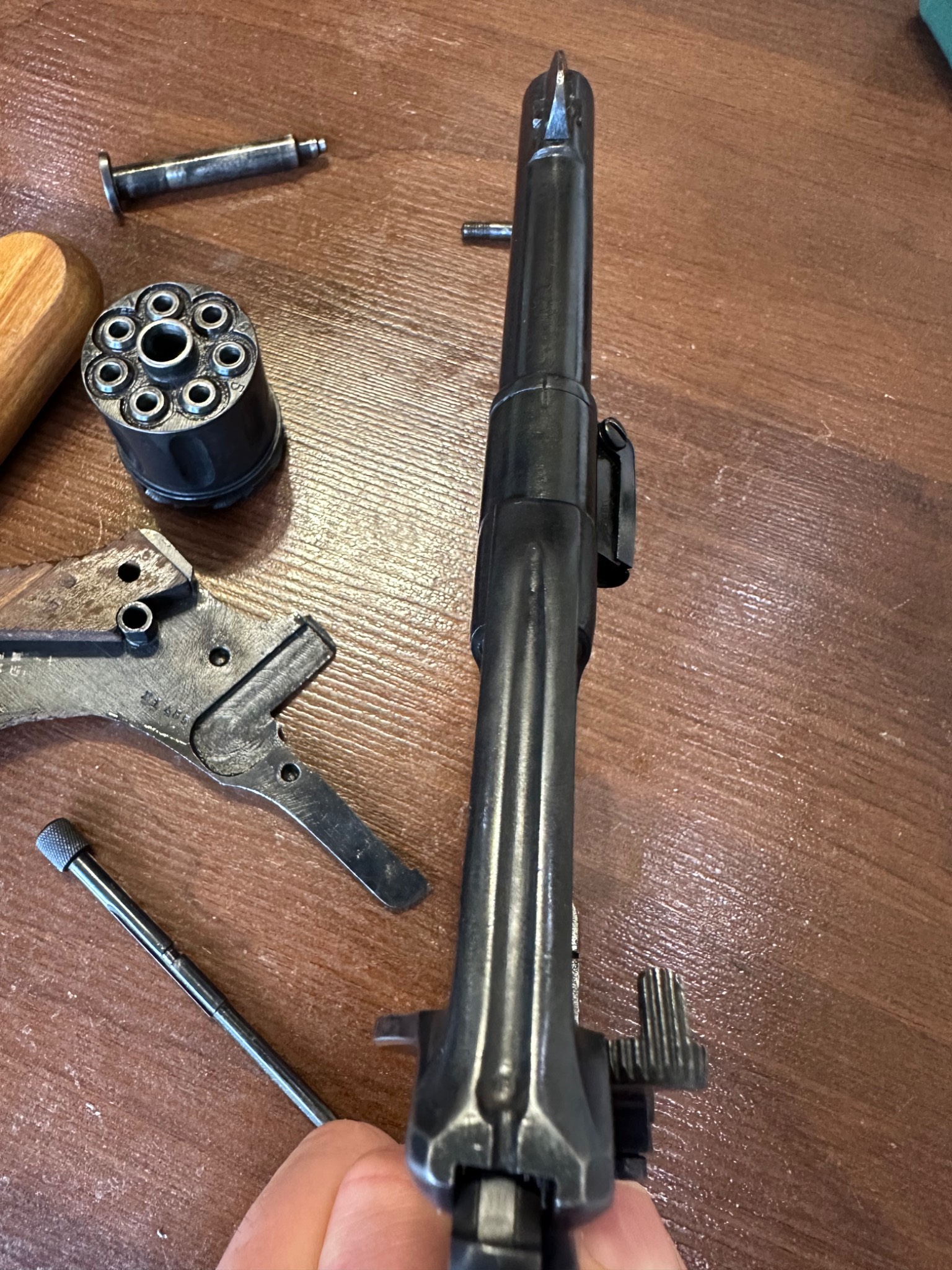 Наган Гром 1928 производства СОБР, почти все детали на молотках, ствол в родном калибре, на дульном срезе видны нитки, в стволе лейнер нарезной 4 мм, все каморы одного диаметра, скорость полета пули 300 м/с есть тесты через хронограф.