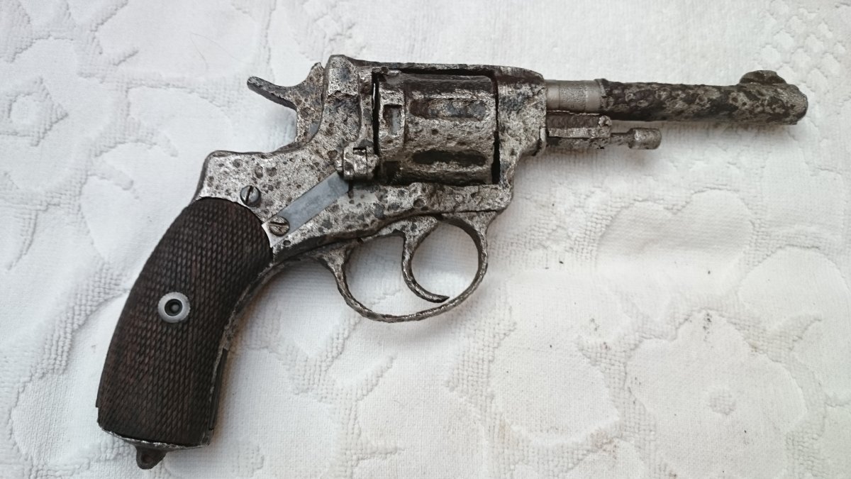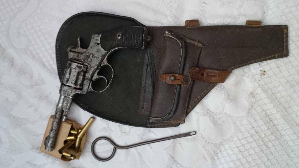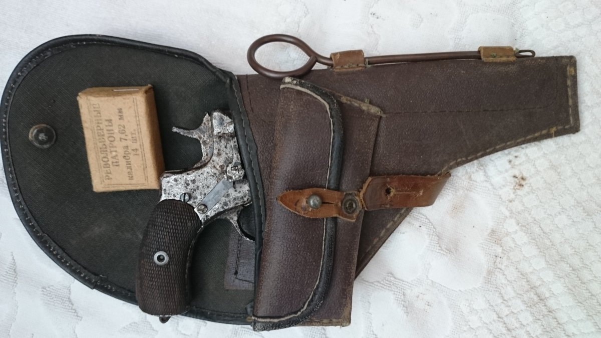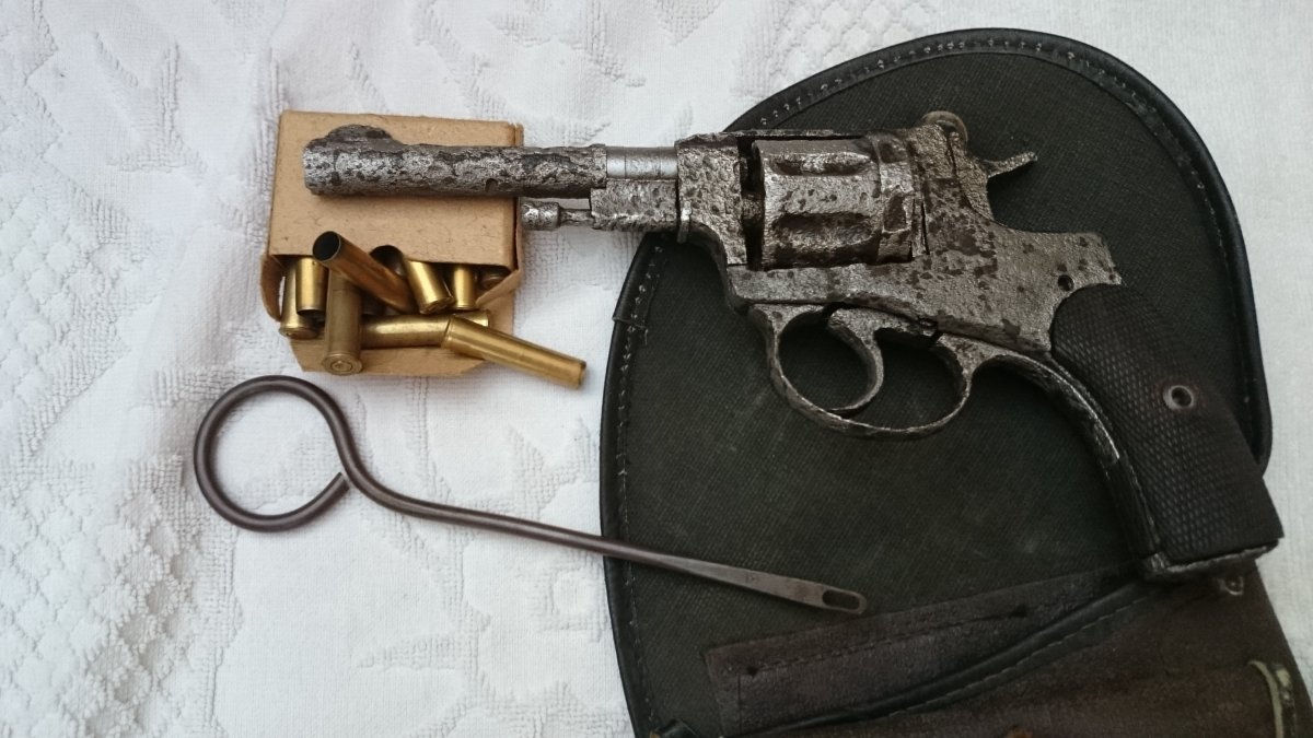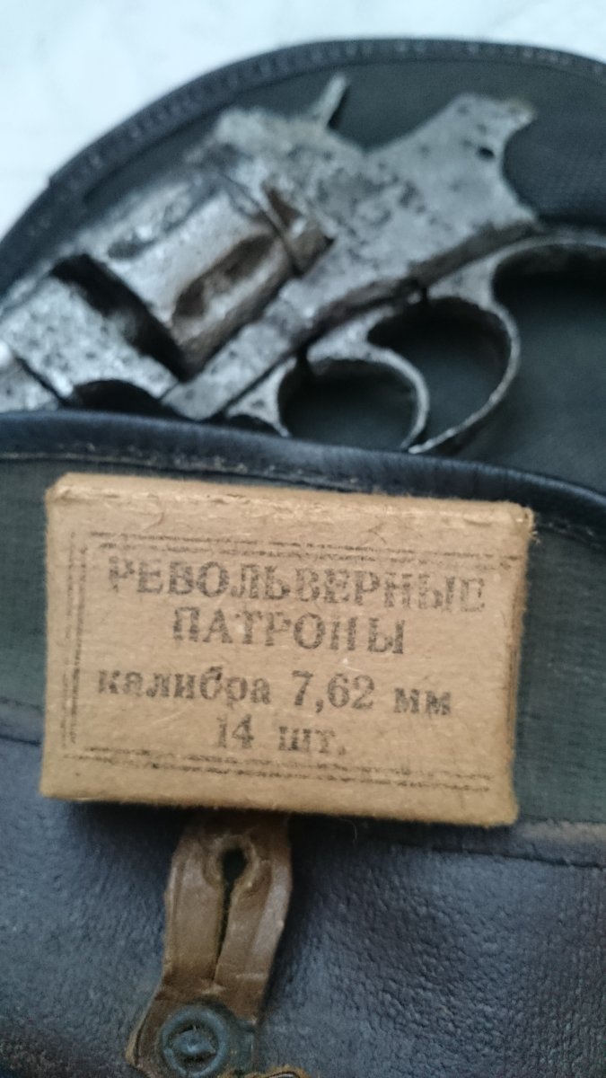 Револьвер Нагана, по остаткам надписи Императорский, была произведена поверхностная чистка, укомплектован пружинами, кобурой(кирза) бронзовый шомпол до 1925г, пачка гильз(14 шт) тирового однострела, накладки царского периода с мелкой насечкой.