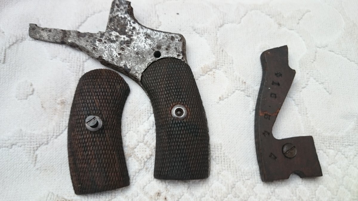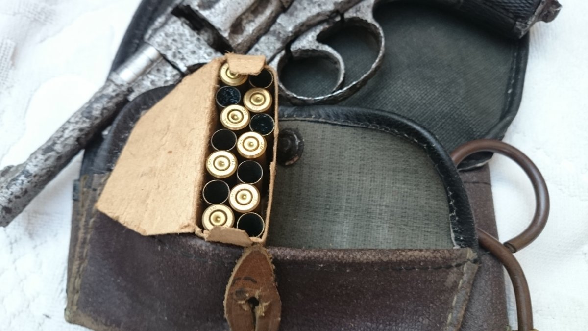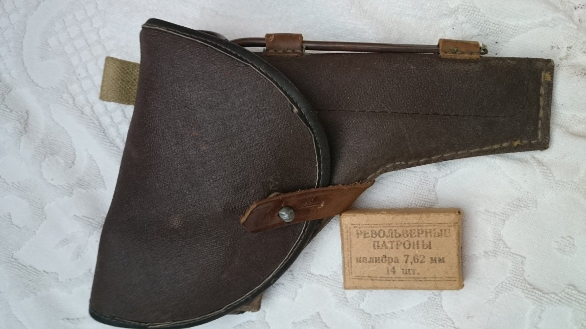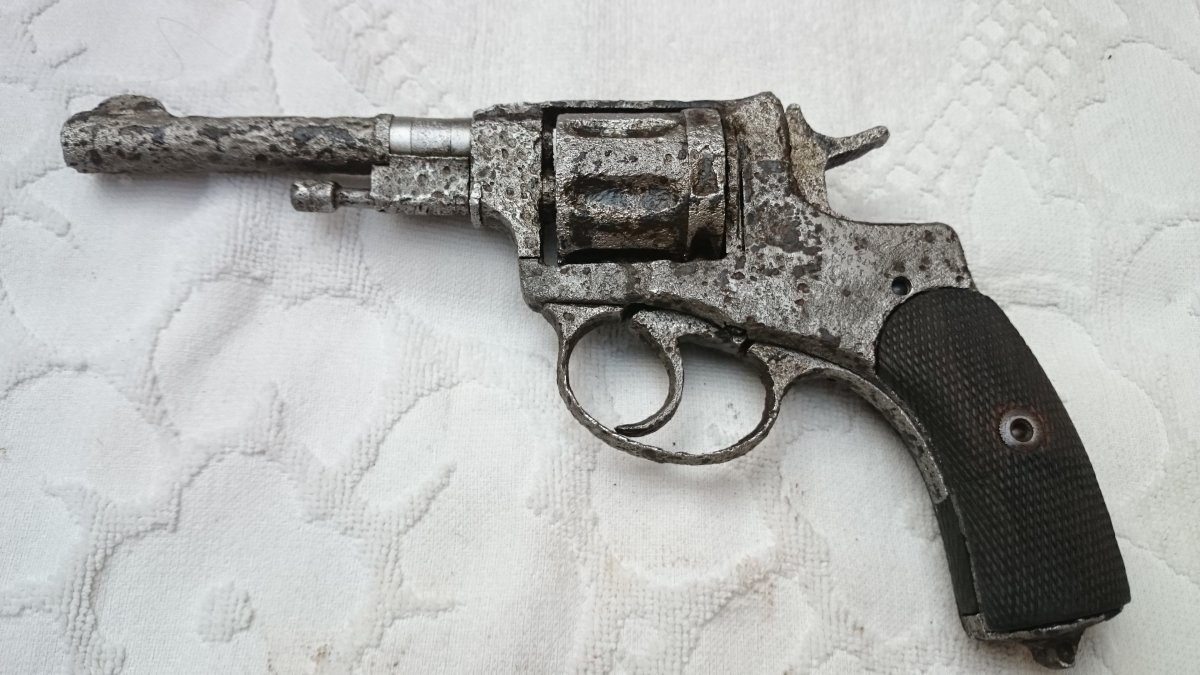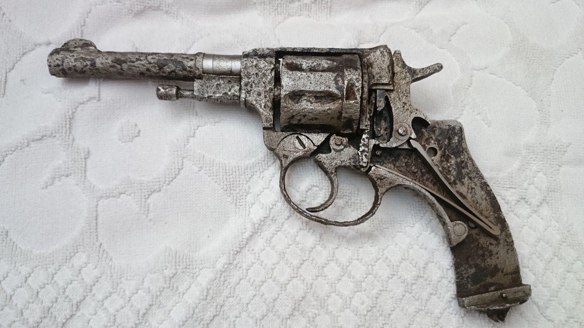 Револьвер Нагана, по остаткам надписи Императорский, была произведена поверхностная чистка, укомплектован пружинами, кобурой(кирза) бронзовый шомпол до 1925г, пачка гильз(14 шт) тирового однострела, накладки царского периода с мелкой насечкой.