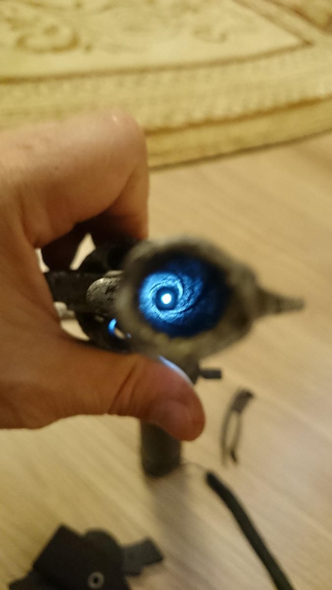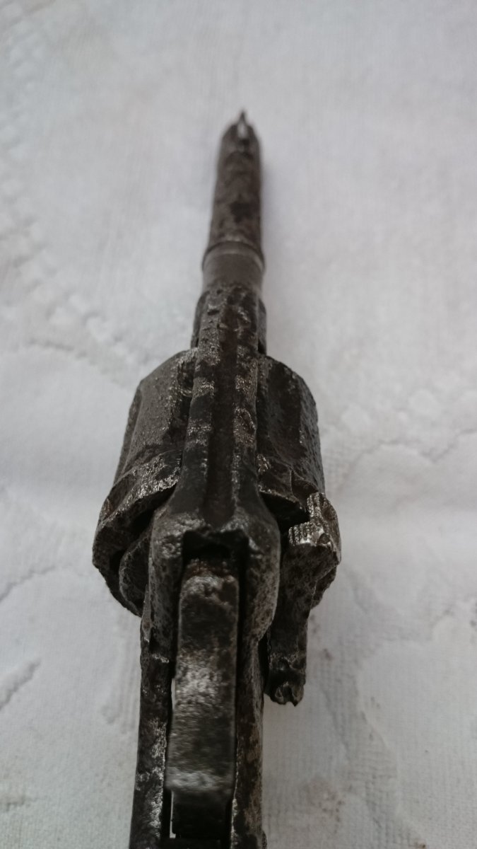 Барабан вращается леко, пружина работает, патрон ммг заходит не полностью,- нужна чистка, стволик очищен от грязи,- нарезы просматриваются, шомпольная трубка с потерями, шомпол и барабан не снимался. Стволик зальётся жидким металлом. Выстрел произвести невозможно,- при нажатии курка происходит западание(фото-5),- поэтому продаётся как ММГ с 1 гривни. С ув.