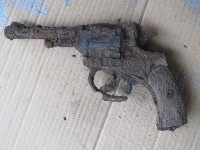 Здравствуйте уважаемые камрады! Наган найден в лесу Полтавской области, сильно под уставший как вы видите. Смотрите по фото. С уважением.