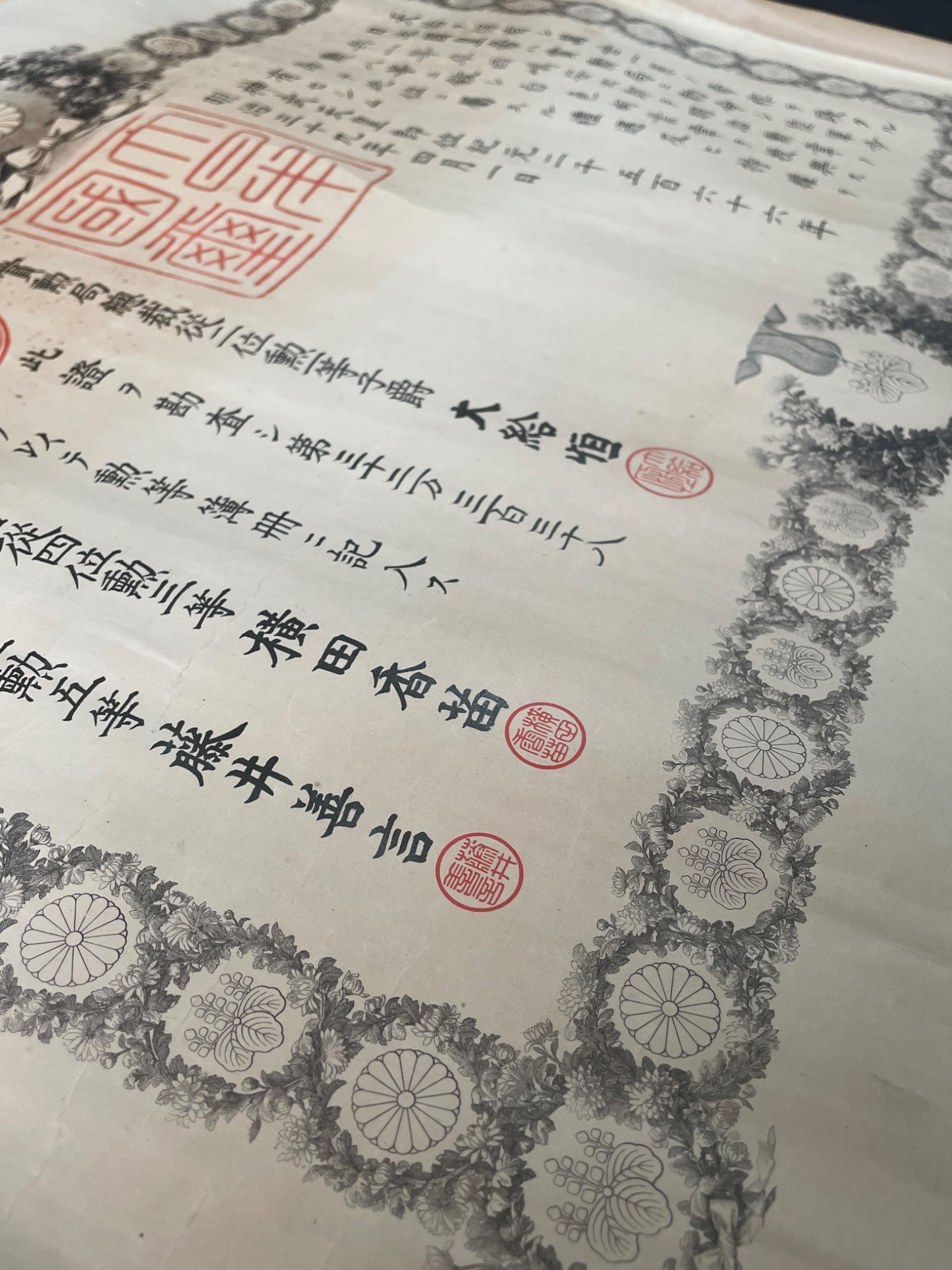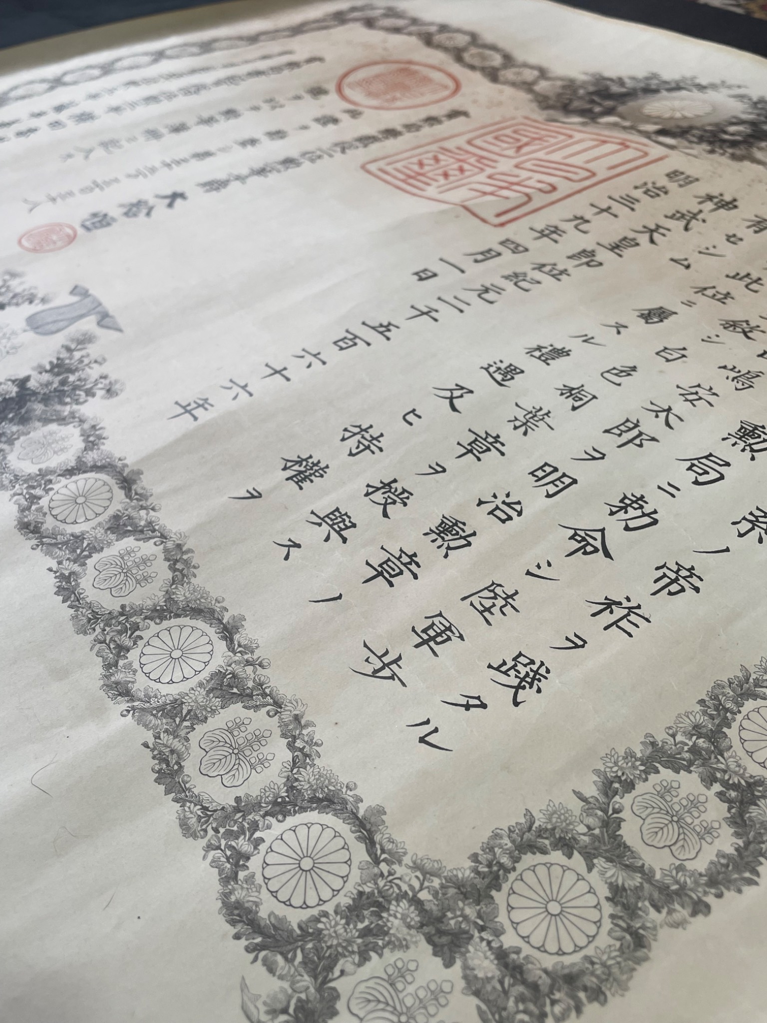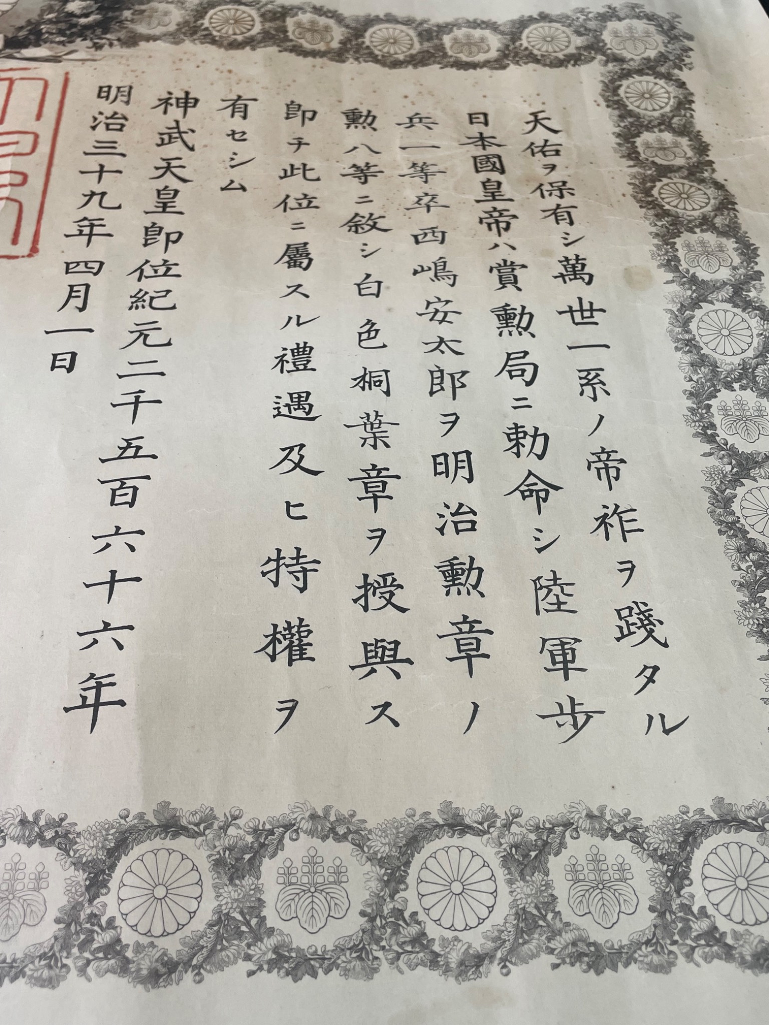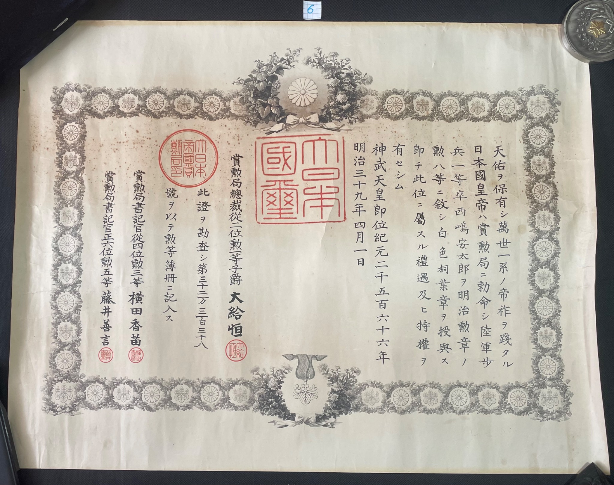 Японія. Нагородний документ на орден Всхідне сонце 8-го ступеня. Вручення 1 квітня 1908 року рядовому солдату першого класу Ясутару Нісідзіма. Документ за русько-японську війну. Розміри 600 на 460 мм. Кути цілі. Чорно-біле лого ордена. Як на документ того періоду нормальний стан. Чудове доповнення до вашої колекції.