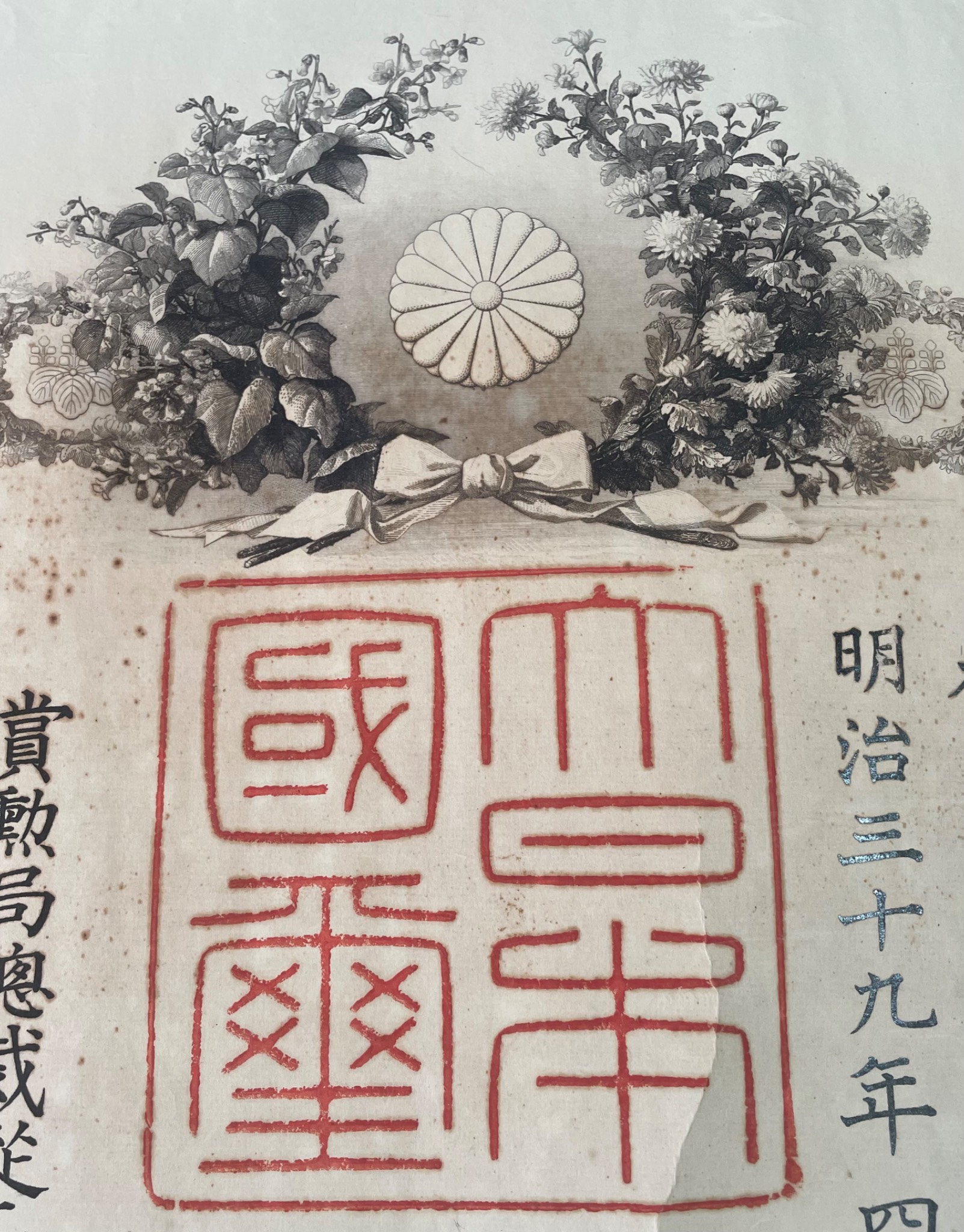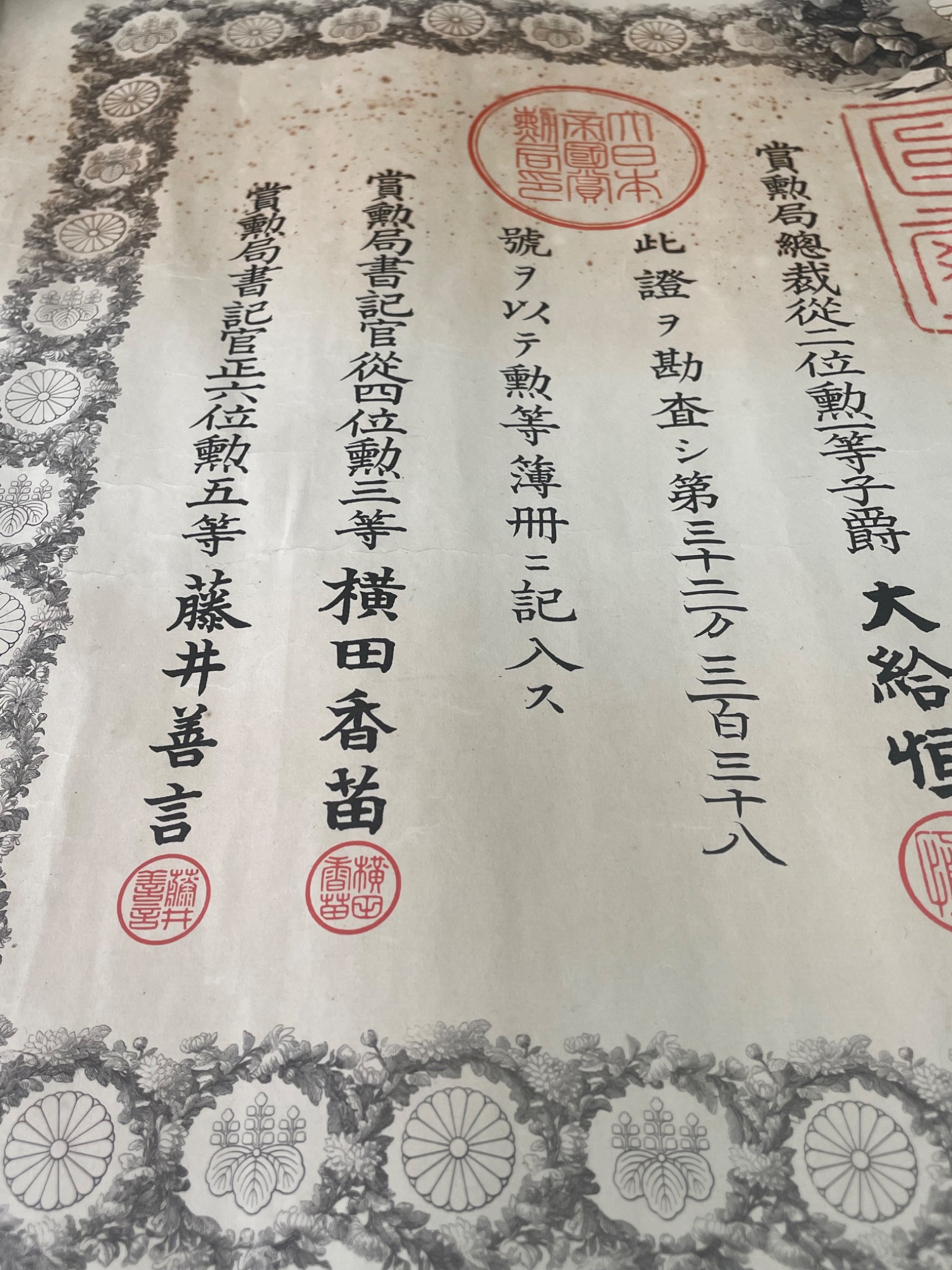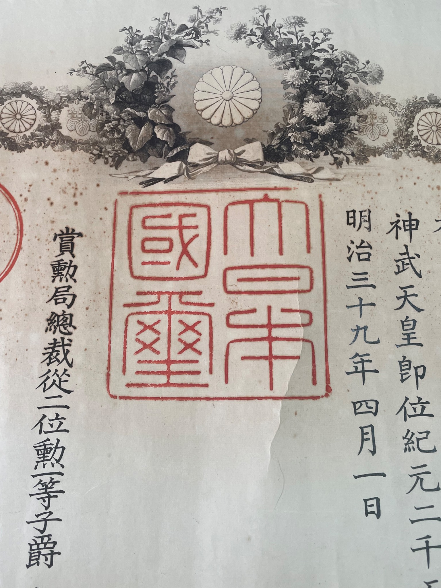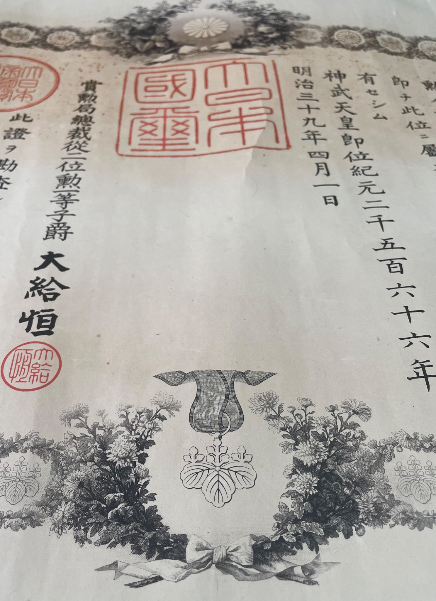 Японія. Нагородний документ на орден Всхідне сонце 8-го ступеня. Вручення 1 квітня 1908 року рядовому солдату першого класу Ясутару Нісідзіма. Документ за русько-японську війну. Розміри 600 на 460 мм. Кути цілі. Чорно-біле лого ордена. Як на документ того періоду нормальний стан. Чудове доповнення до вашої колекції.