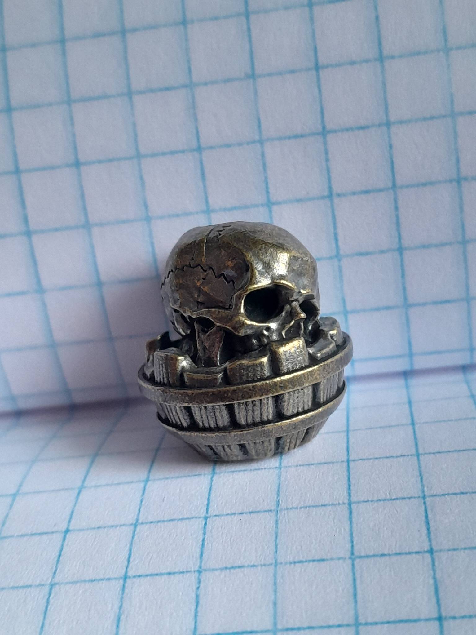 Оригінальна намистина у вигляді Череп в бочці — ідеальне доповнення для браслетів, паракорд-прикрас, ножових темляків чи брелоків. Виготовлена з мідного сплаву з ефектом старовини , надає виробу характеру та мужності.