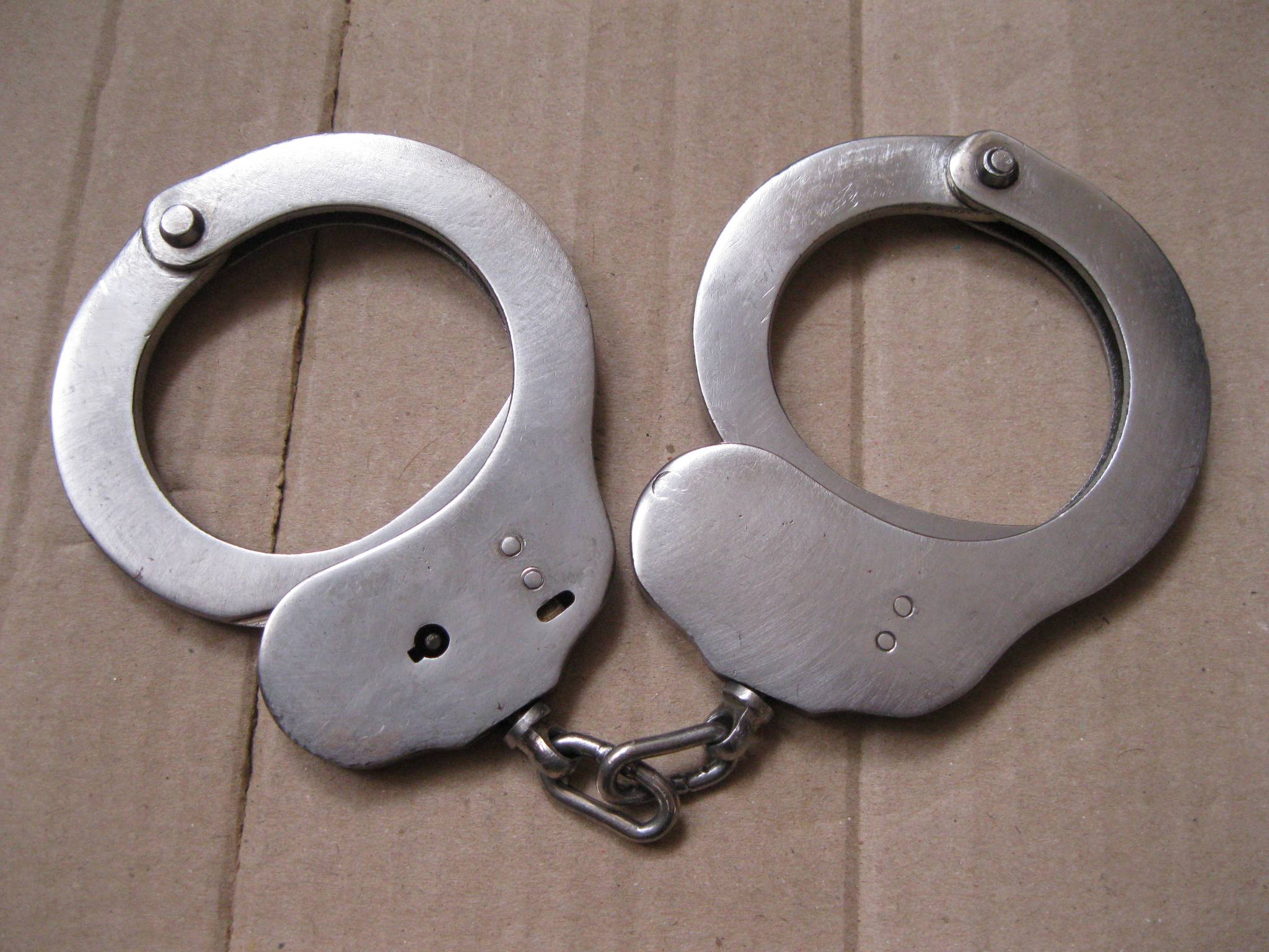 Наручники + ключ, уживані але робочі, мають додатковий фіксатор який унеможливлює самозатягуваня і ускладнює затриманому зняття.
