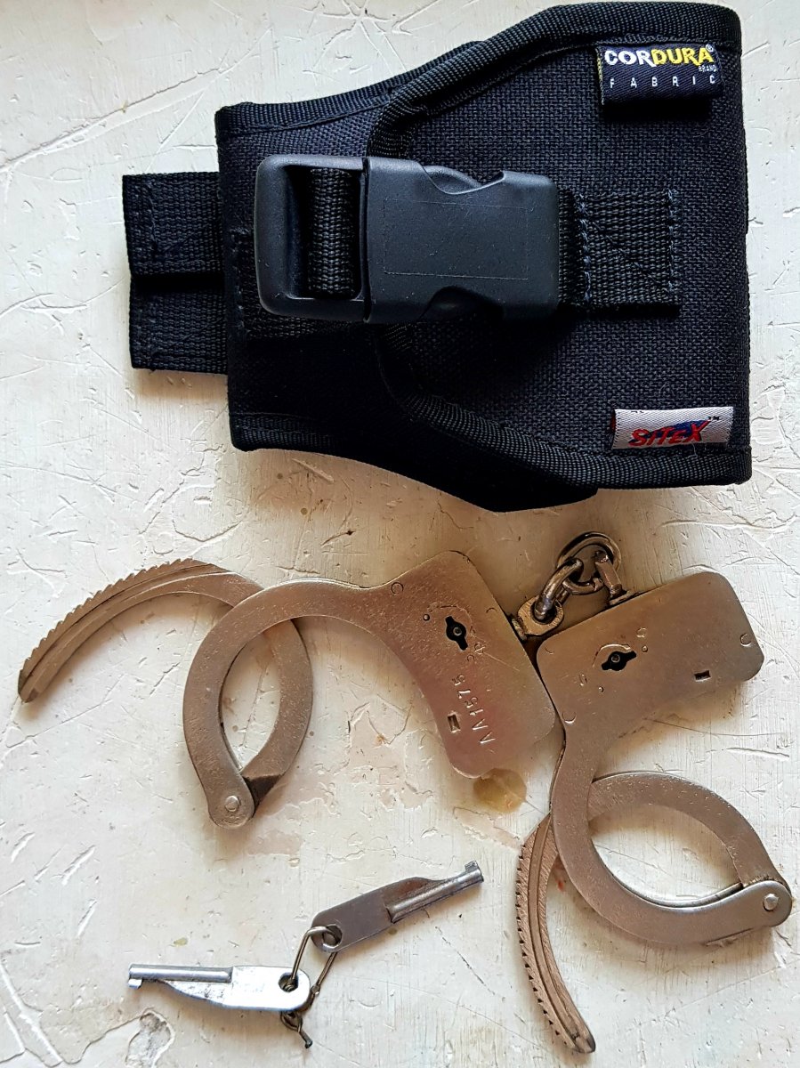 Наручники из первых модификаций советских наручников БРС, год выпуска примерно 70-ые годы. Замок поворотный на 360 градусов из фиксатором. Состояние можно сказать идеальное, все работает и щелкает как положено. Родной ключик утерян, изготовил два новых. Принцип работы такой: при повороте по стрелке к "Ф" замок ставится на фиксатор. При повороте в направлении "О" - замок открывается, причем если до этого был поставлен на фиксатор, повернуть ключик надо два раза. Первый раз снять с фиксатора, второй - открыть. Отличные наручники в коллекцию или использовать по назначению. В комплекте наручники, два ключа, подсумок CORDURA.