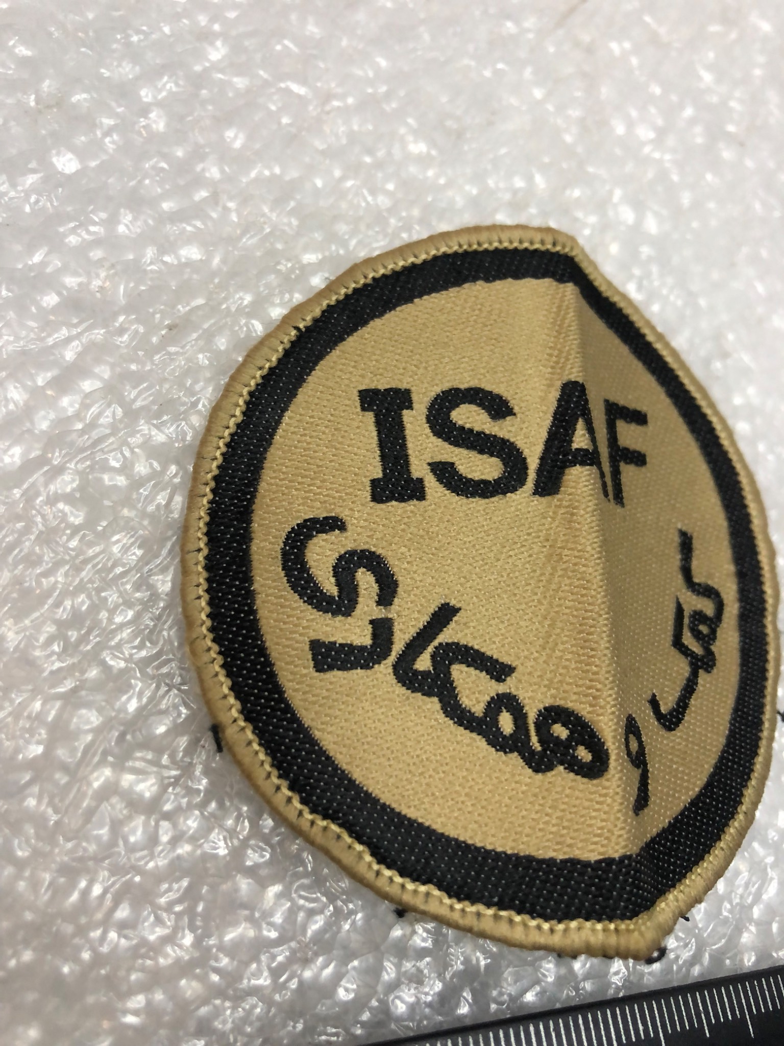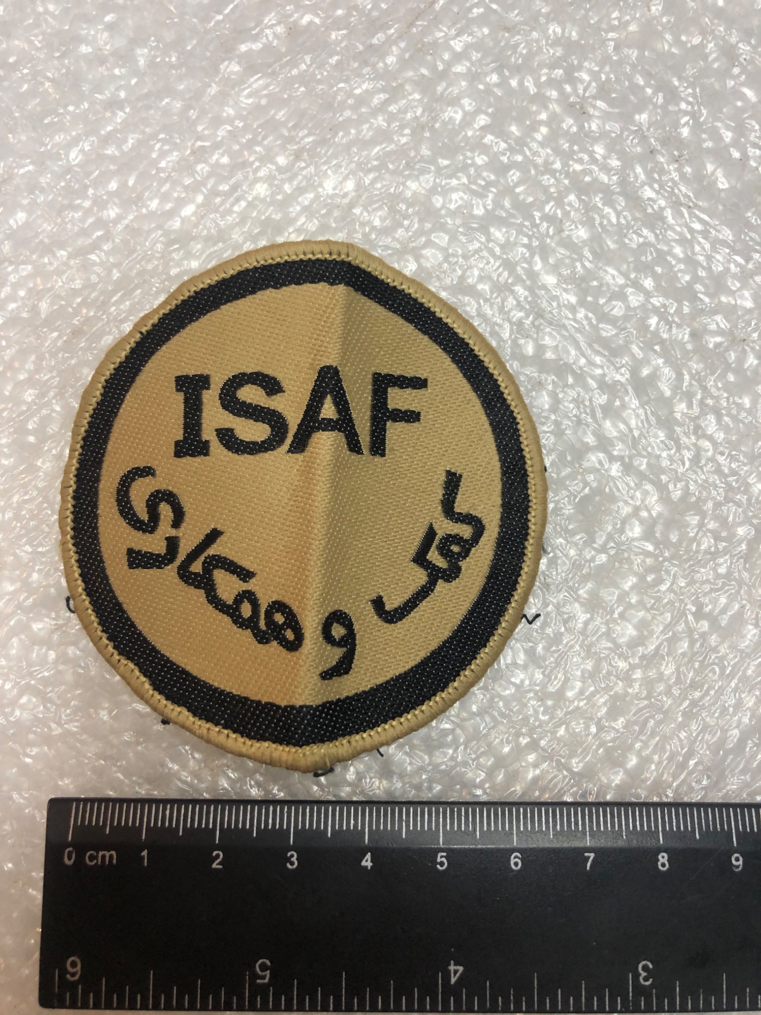 * **Внешний вид:** Нашивка представляет собой прямоугольную или слегка закругленную сверху и снизу нашивку (наподобие "щитка") черного цвета с белой окантовкой и белой аббревиатурой **"ISAF"**.