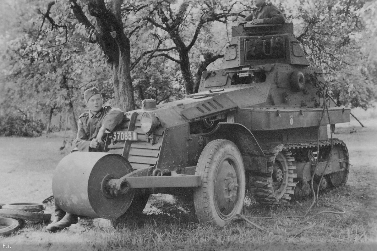 Немецкие солдаты позируют на брошенном французском бронеавтомобиле AMC Schneider P16