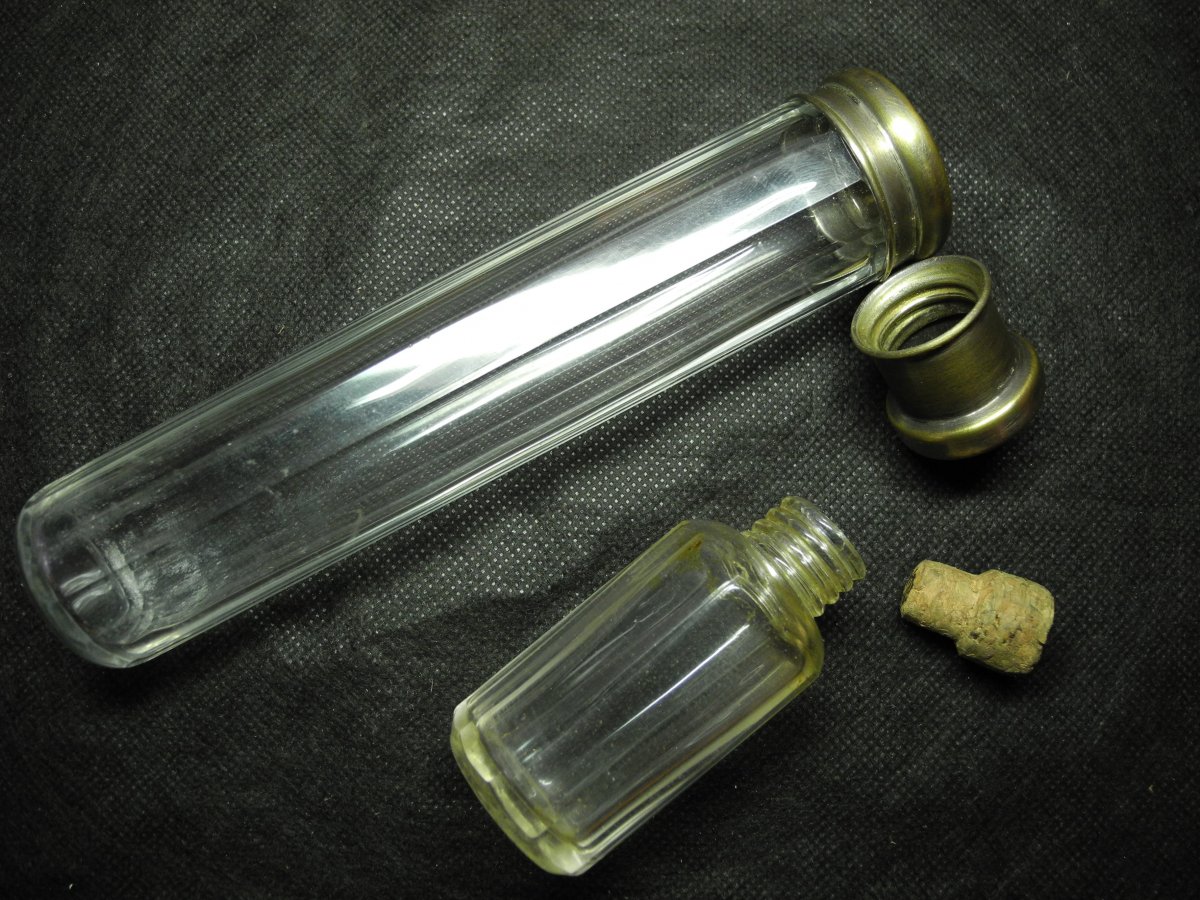 14. Стеклянный флакон для одеколона. Пробка и латунный колпачок.