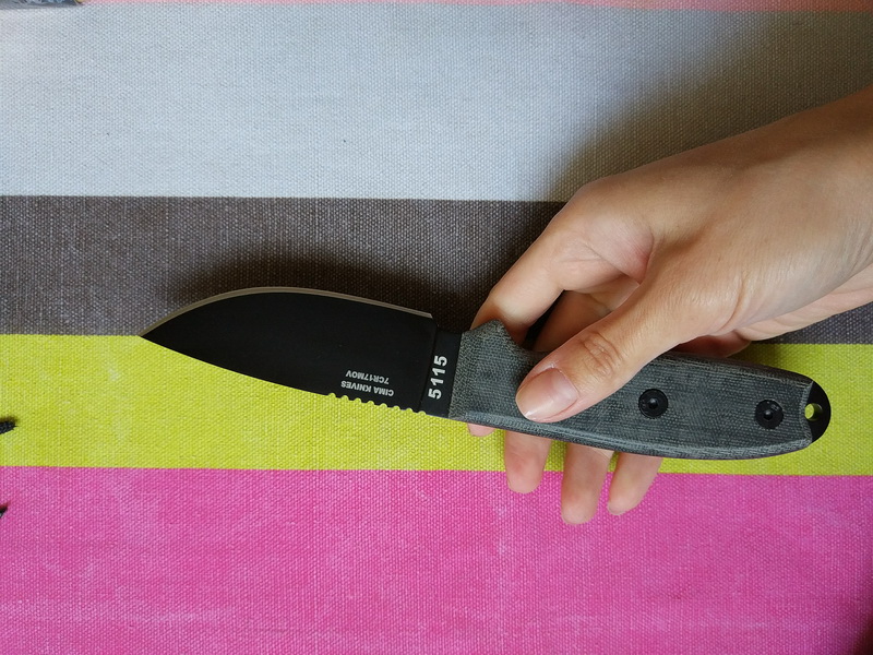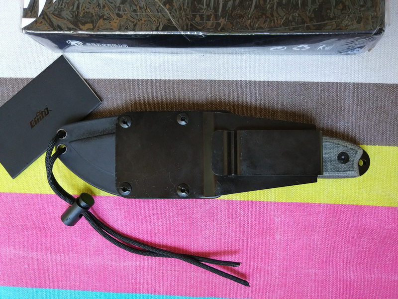 Конструкция ножа - фултанг, завершается «выступом», в котором имеется отверстие под темляк. Упор довольно развитый, позволяет уверенно оперировать ножом при любых действиях. Хорошей ширины клинок, со спусками от обуха, изготовлен из стали 7CR17MOV (и покрыт черным покрытием, производитель заявляет нитрид титана и судя по отзывам покрытие действительно весьма качественное и стойкое). Накладки на рукояти - микарта. Нож комплектуется черными ножнами из термопластика со съемной стальной клипсой.