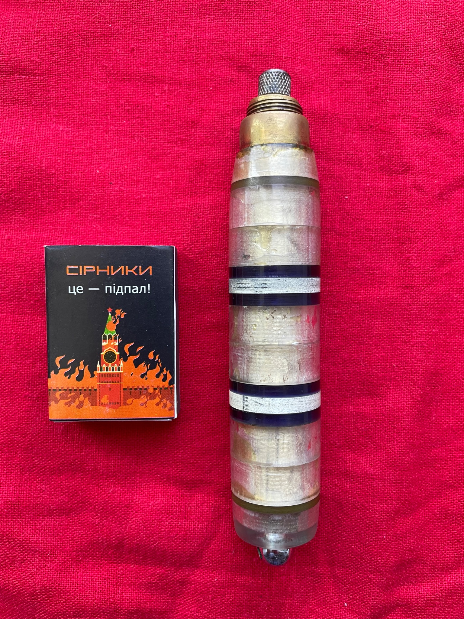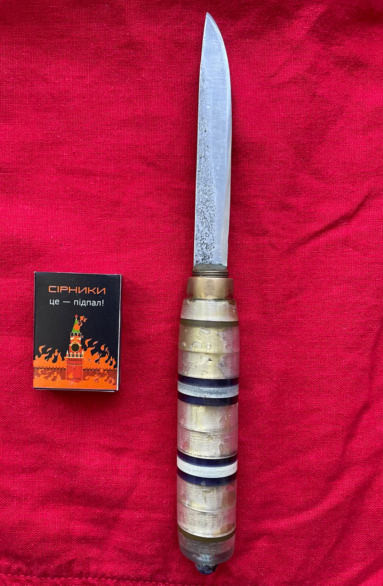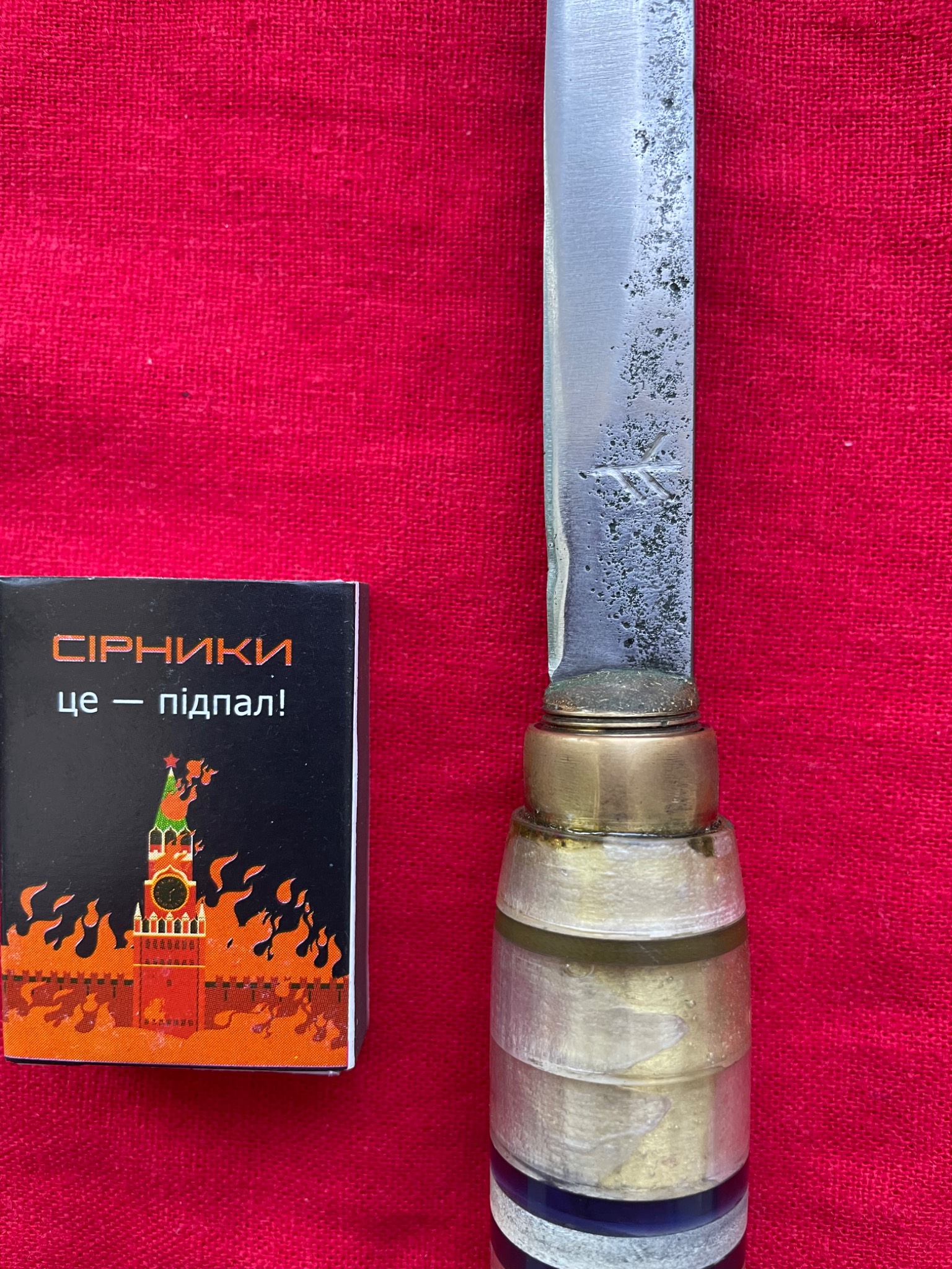 Розкладний ніж на гвинтовому зʼєднанні клинка з руківʼям. Матеріал руківʼя - набірний пластик ( органічне скло) з проставками.