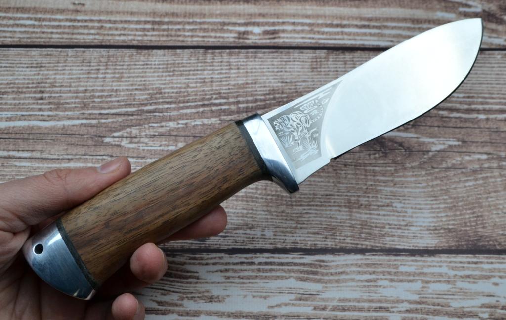 Хороший разделочный нож с широким клинком, имеющим пологие вогнутые линзовидные спуски от самого обуха, образующие тонкое, прекрасно режущее лезвие. Демонстрирует отличные режущие качества. Форма клинка, типичная для скинера, позволяет снимать шкуру разделываемого животного, не боясь повредить при этом брюшину. Клинок с толщиной обуха в 3 мм имеет большую пяту, что позволяет работать ножом при разделке разными хватами. Рукоять прочно ложится в ладонь. Монтаж клинка сквозной, неразборный. Отличный выбор для разделочных работ на охоте и на ферме.