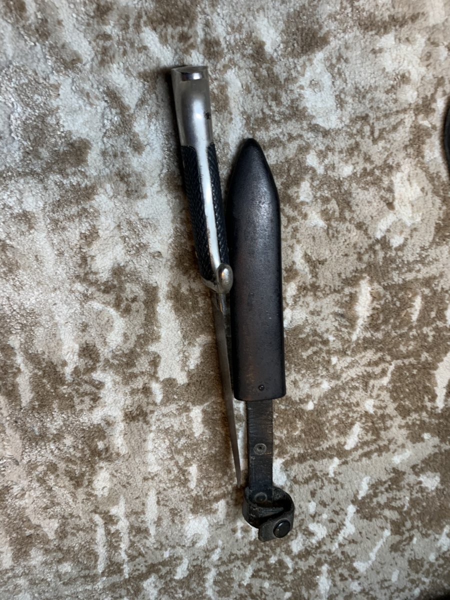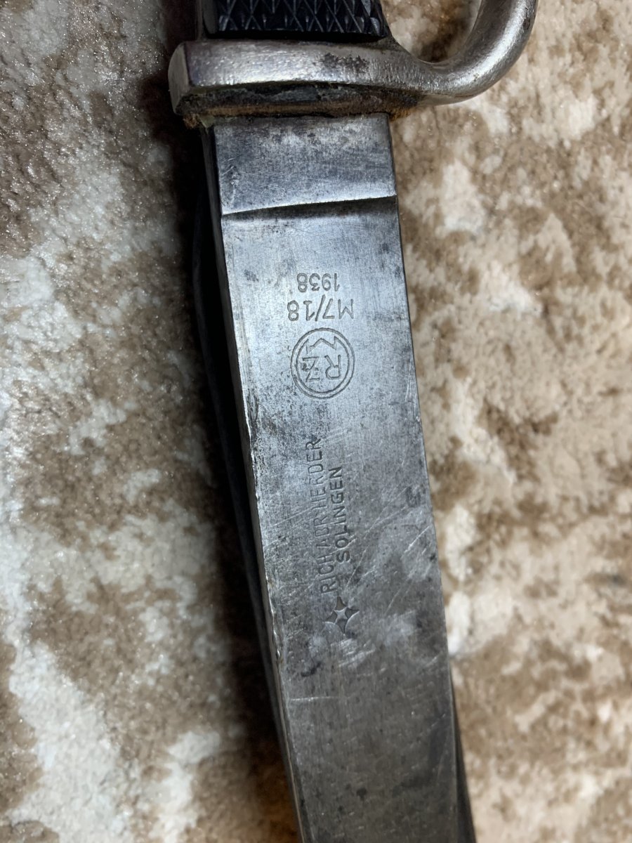Продам переходную модель ножа Гитлерюгкенд очень редкого производителя ножей этого типа фабрики Richard Hedler с rzm клеймом и девизом Кровь и Честь на самом клинке.Нож оригинальный.Так как эти ножи носили мальчики они ими активно пользовались поэтому в идеальном сохране их у нас проблематично найти.Этот нож в хорошем коллекционном сохране.Эмблема не имеет люфта но под микроскопом в местах между пластиком и ромбом клея небыло обнаружено поэтому ромб не вытаскивали. весь предмет проверял лично магнитом и там где надо он вёл себя правильно.Смею предположить что перекрас ножен был выполнен в тот период так как видно что краска очень старая.Ножны от него родные.Геометрия клинка не нарушена рукоять без видимых дефектов и заклепки родные.