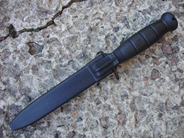 Общая длина ножа Глок составляет 290 мм, вес - 206 грамм. Клинок ножа длиной 165 мм изготавливается из пружинной углеродистой стали марки 1095, термообработанной до твердости примерно 55 единиц HRC. Наибольшая ширина клинка 22 мм, максимальная толщина 5,0 мм. Для защиты от коррозии на его поверхность нанесено черное оксидное покрытие. Твердость HRC 55. Австрийские конструкторы намеренно пошли на некоторое снижение твердости, сделав клинок более упругим и менее хрупким. Кроме того, клинок из такой стали доставляет меньше проблем при заточке. Поверхность рукоятки шероховата на ощупь, что позволяет надежно удерживать нож в руке. Надежность хвата дополнительно повышают пять поперечных кольцевых проточек на ее поверхности. Полость внутри рукоятки очень плотно закрыта пластмассовой крышкой.