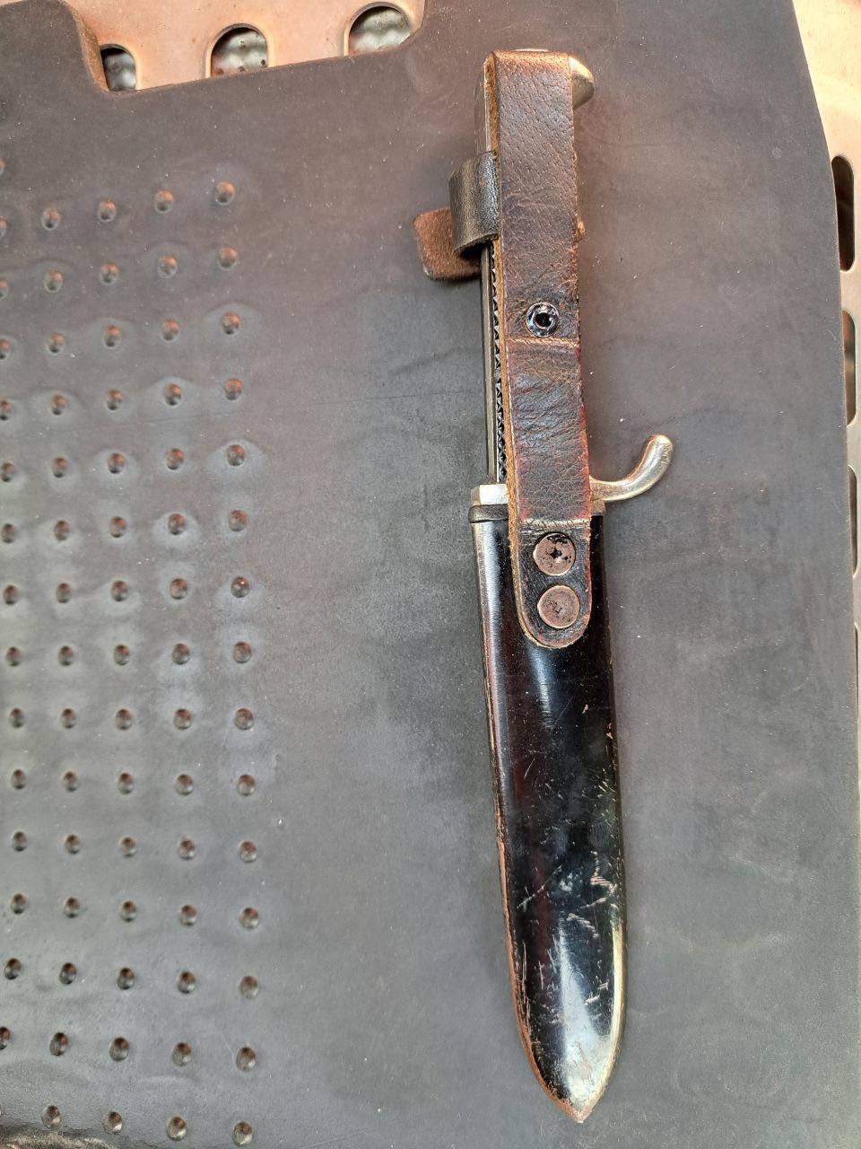 Ножны в родном покрытии без коррозии, тёмно-коричневый кожаный подвес.