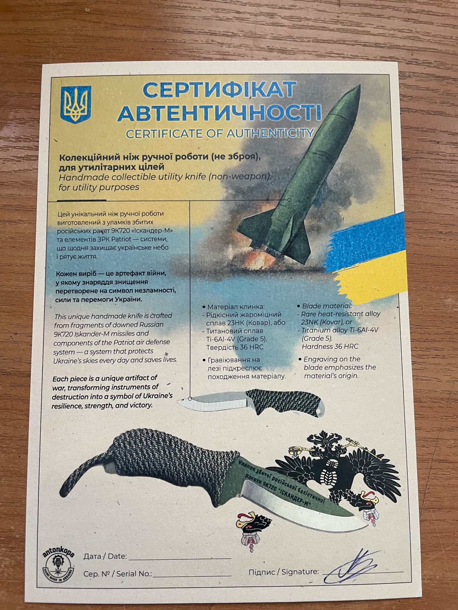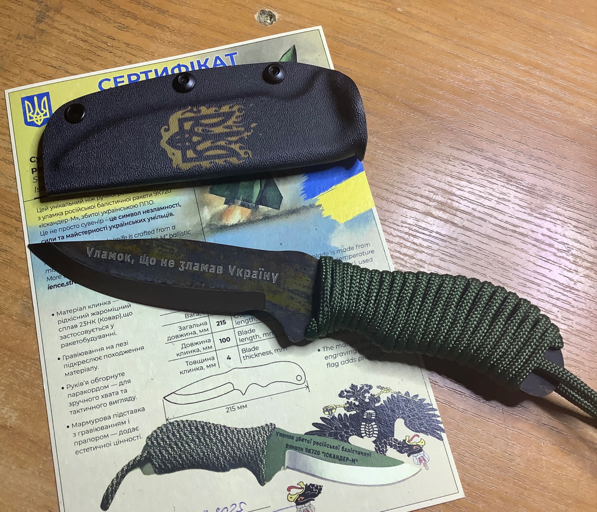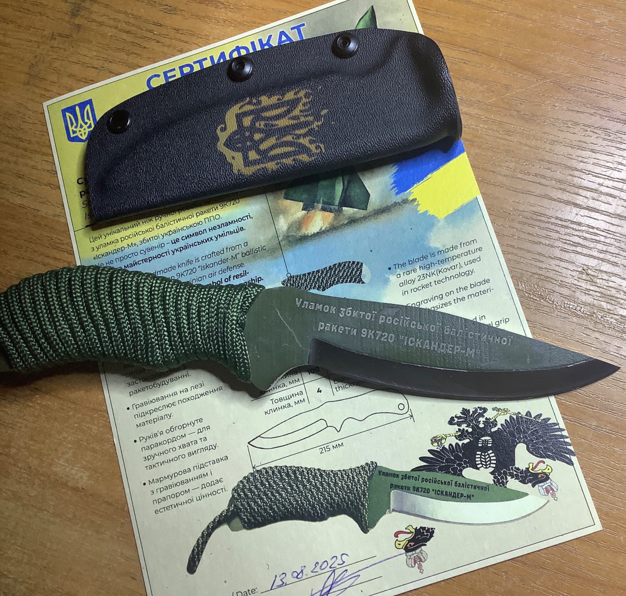 Унікальний ніж ручної роботи, виготовлений з уламка збитої російської балістичної ракети 9К720 «Іскандер-М». Це не просто сувенір, а справжній символ незламності, сили та майстерності українських умільців.