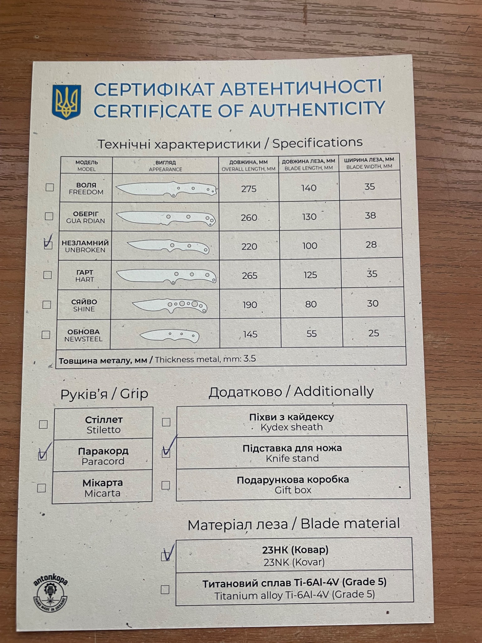 Матеріал клинка – рідкісний сплав 23НК (Ковар), що використовується в ракетних технологіях.