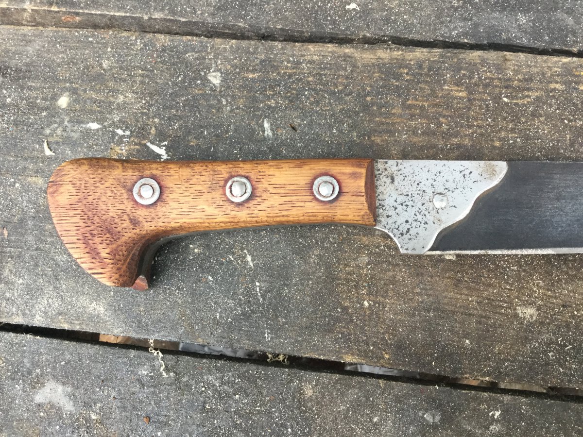 Ручка дуб, клинок из полотна советской ножовки, общая длина 48см, длина клинка 36см, толщина 1мм , заводское воронование-инстркментальная сталь. Приятно лежит в руке центер тяжести у рукояти.