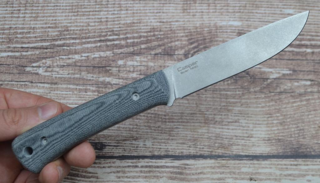 Нож Camper (с англ. - турист) компании N.C. Custom - классический походный нож среднего размера. Клинок Drop-Point со спусками от обуха. Материал клинка - сталь N690 от компании Bohler. Сталь N690, как правило, применяется для изготовления ножей, работающих в тяжёлых или даже экстремальных условиях. Клинок из данного сплава способен длительное время сохранять остроту режущей кромки, обладает высокими антикоррозийными свойствами, отлично сопротивляется боковым и ударным нагрузкам.