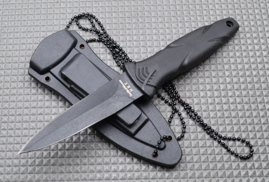 Небольшой обоюдоострый нож с фиксированным лезвием (кинжал) от компании Смит и Вессон был скопирован китайскими мастерами совсем недавно. Реплика ножа получилась удачной и мало в чем уступает оригиналу. Нескользящая рукоять из резиноподобного полимера позволяет крепко держать кинжал в руке. В комплект входят жесткие ножны из пластика, их можно носить как на поясе или снаряжении (есть съемная клипса), так и в обуви (в качестве «резервного» клинка). Нож фиксируется в ножнах с помощью простого, но надежного замка – случайно выпасти ему оттуда не удастся. В рукояти предусмотрено отверстие для темляка, куда можно протянуть идущую в комплекте длинную цепочку и повесить кинжал на шею.