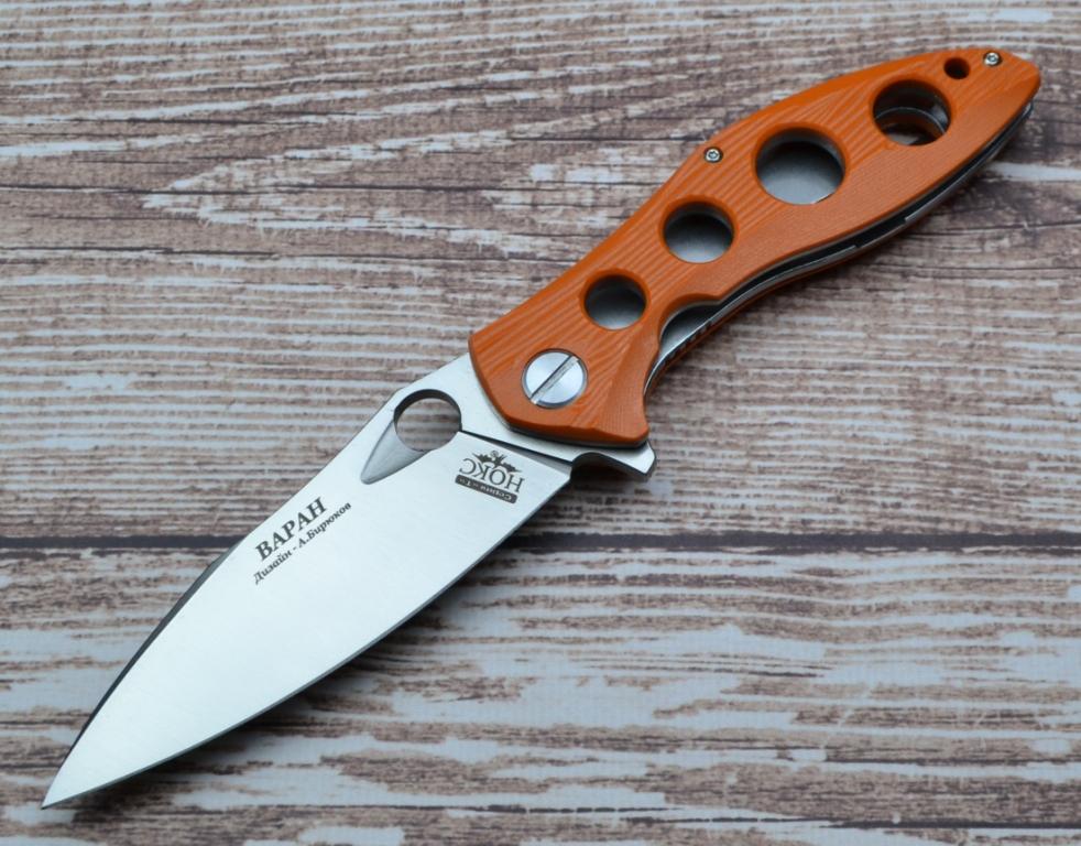 Складной нож Варан Нокс сталь D2 новинка компании 2019 года. При разработке ножа ставились цели достичь максимальную надежность, практичность, функциональность и удобство для решения широкого спектра задач. Он прекрасно подходит как для постоянного ношения в повседневной жизни, так и для путешествий и выходов на природу в качестве универсального полевого инструмента. Широкий клинок ножа изготавливается из прочной инструментальной стали Д2 обладает превосходными режущими свойствами и способен долго держать заточку. Насечки на обухе клинка предназначены для упора большим пальцем и лучшего контроля над клинком. Вентилируемые накладки на рукоять черного цвета выполнены из прочного стеклотекстолита G10, который не боится высокой влажности, перепадов температур и проявляет устойчивость к механическим повреждениям. Круглые отверстия в рукояти снижают вес ножа и противостоят скольжению в мокрой ладони. Изогнутая эргономичная форма рукояти и наличие надежного упора обеспечивают уверенный хват и удобство работы. Для комфортного ношения ножа на элементах одежды или снаряжения предусмотрена специальная упругая клипса.