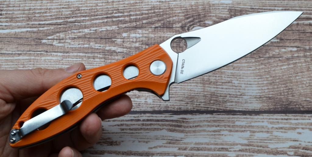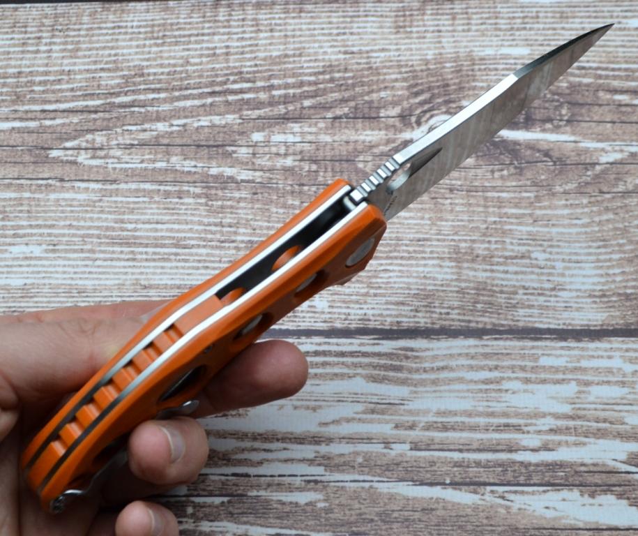 Нож мгновенно открывается вручную любой рукой с помощью плавника-флиппера, или оригинального отверстия с выемкой на клинке. Легкости открытия способствует осевой узел, собранный на подшипниках. В рабочем положении клинок блокируется надежным замком типа лайнер-лок. Твердость стали 60-61 HRC.