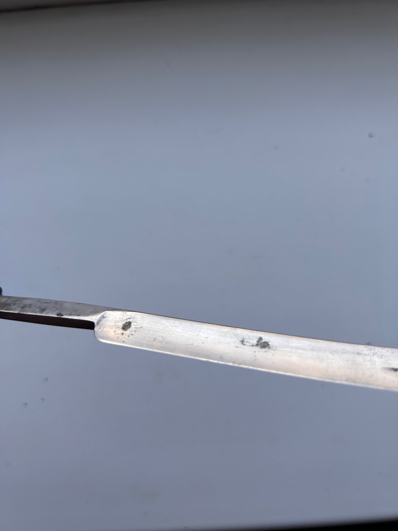 Сосотоянте отличное, небольшие потемнения на лезвии от воды. Острая, но для использования нужно заточить.