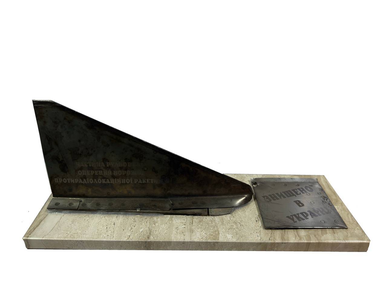 На мармуровій підставці закріплене оперення противолокаційної ракети Х-31, яку збили наші сили ППО в небі над Київщиною. Ракета Х-31 — це російська крилата ракета, розроблена для ураження морських і наземних цілей. Вона була створена в 1970-х роках і призначена для використання з літаків, таких як Су-24, Су-30 та інші бойові літаки. Х-31 має високу швидкість, що дозволяє їй ефективно долати системи протиповітряної оборони противника. В останні роки ракети Х-31 активно використовуються росією в різних конфліктах, зокрема під час військових операцій в Сирії та Україні. Їх застосування дозволяє російським військовим завдавати ударів по стратегічних об'єктах, таких як військові бази, склади боєприпасів та інші важливі інфраструктурні об'єкти. І лише за допомогою сил ППО більшість ракет вдається вдало збивати. Завдяки своїй конструкції та можливостям, ракети Х-31 можуть бути оснащені різними типами бойових частин, що робить їх універсальними для різних сценаріїв бойових дій. Вони здатні вражати цілі на значних відстанях, що підвищує ефективність російських військових операцій. Використання ракет Х-31 також викликає занепокоєння у міжнародної спільноти, оскільки їх застосування може призводити до значних руйнувань і жертв серед цивільного населення. Це підкреслює важливість контролю за розповсюдженням таких видів озброєння та необхідність міжнародного діалогу щодо зменшення напруженості в регіонах війни.